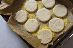 ausstechen. Den restlichen Teig wieder zusammenkneten. Die Kreise in Polenta „wälzen“ und z. B. auf ein mit Backpapier ausgelegtes und mit Polenta bestreutes Blech legen. Den übrigen Teig wieder ausrollen und ausstechen. So weiter verfahren bis der Teig aufgebraucht ist.