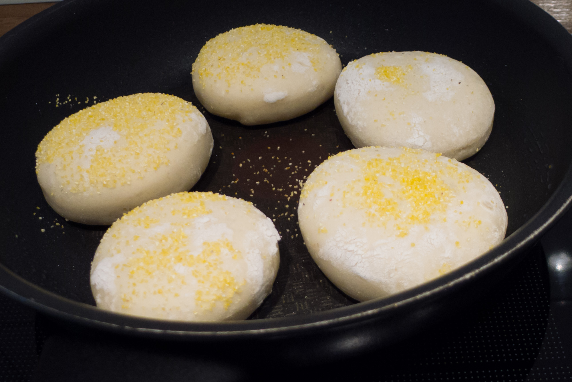 Die Hitze so justieren, dass die Brötchen nach 5 Minuten pro Seite jeweils eine gute braune Kruste haben, aber weit entfernt sind vom Verbrennen (braucht je nach Herd und Pfanne ggf. einige Versuche um es herauszufinden).