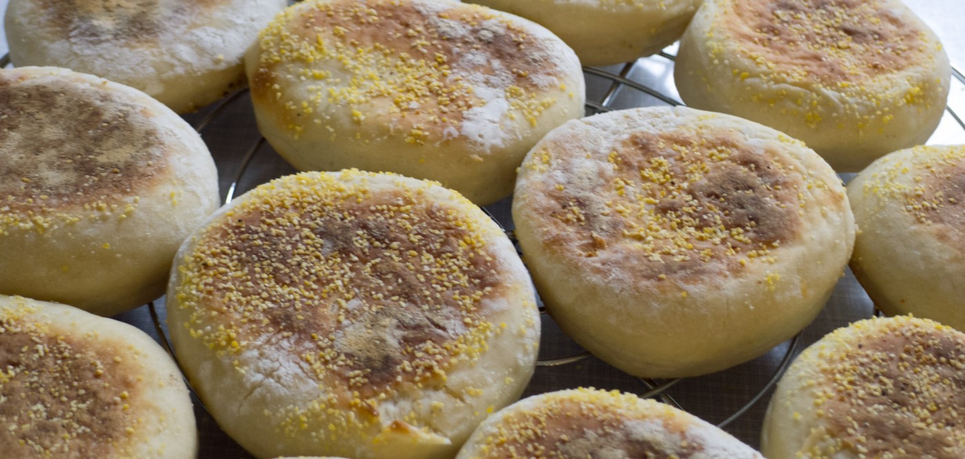 Mein heutiges Rezept beschäftigt sich mit Brötchen, die in der Pfanne gebraten werden und für die man somit keinen Ofen braucht. In der englischsprachigen Welt (außerhalb von Großbritannien) hören sie auf den Namen English Muffins, in England selbst werden sie einfach Muffins genannt und mir sind die zunächst jahrelang nur als Toasties begegnet. Die werden bei jedem Discounter von der Hausmarke angeboten und bei größeren Supermärkten meist von namhaften Brotherstellern. Ich hatte eine Art Hassliebe zu ihnen: ich mochte sie sehr, wollte es mir selbst gegenüber aber nicht zugeben und tänzelte deswegen häufig beim Einkaufen drumherum. Las mal wieder die Zutatenliste auf den Packungen und entschied mal für mal gegen den Kauf.
