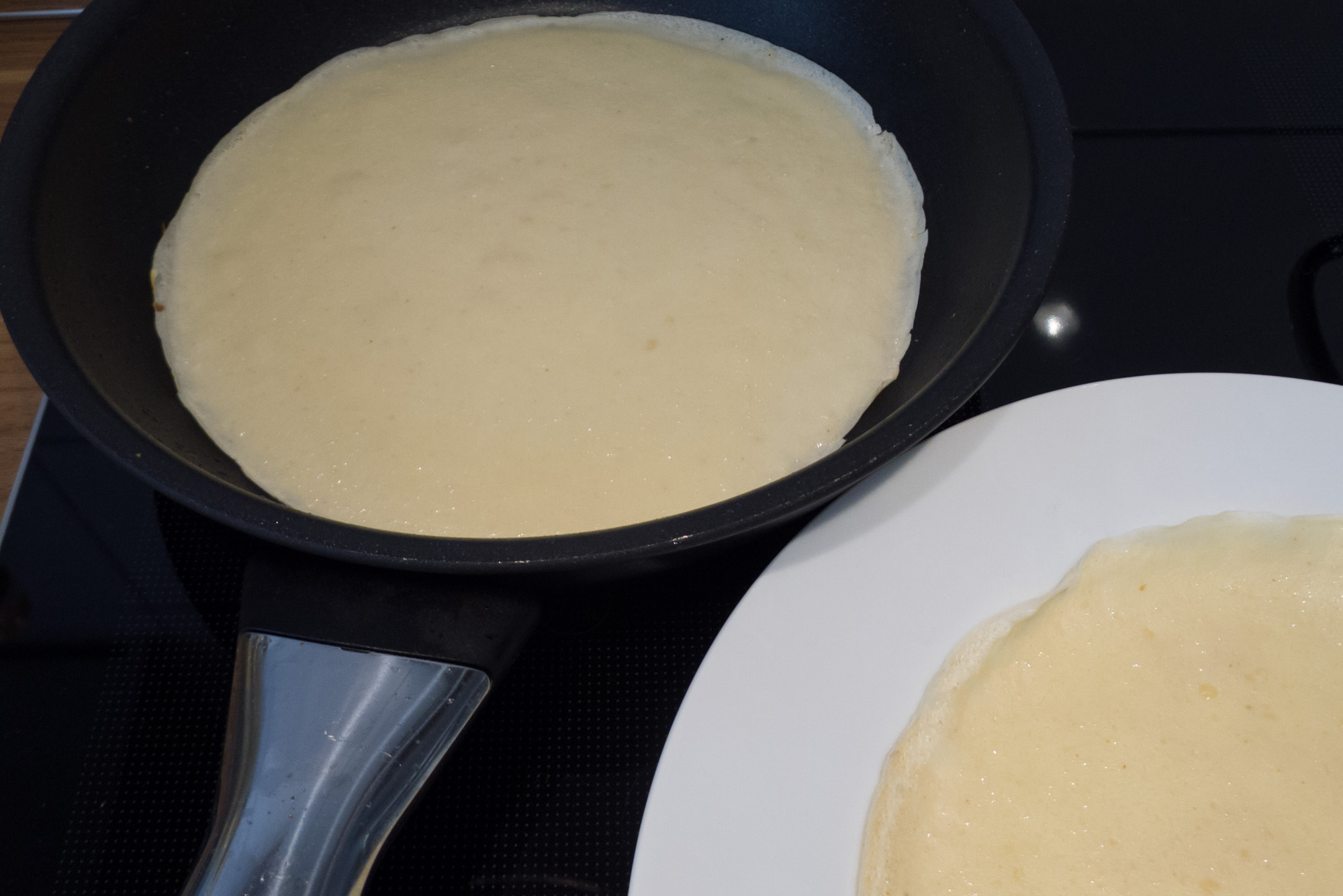 Vorher aber noch einige Worte zum Teig. Verwendet wird der von mir bereits gepostete Pannkuke-Teig und es sollte zumindest eine 2-Personen-Menge vorgehalten werden: es muss zunächst ein einfacher Pfannkuchen gebacken werden, um die Pfanne vorzubereiten. Am Schluss sollte lieber noch Teig für weitere einfache Pfannkuchen übrig sein, als zu wenig um den letzten gefüllten Pfannkuchen abzudichten. Ich verwende für diesen Teig normalerweise möglichst feines weißes Mehl, z. B. das italienische Tipo 00, habe heute aber – in Ermangelung von Alternativen im Vorratsschrank – auch mit 1050er Weizenmehl gute Ergebnisse erzielt.