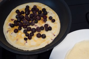 Ich weiß nicht mehr mit welchen Beeren Tante Katharina an dem betreffenden Tag ihre Pfannkuchen füllte, möglicherweise waren es Johannisbeeren. Ich erinnere mich dunkel, dass ich damals als Teenager Versuche unternahm, sie zu Hause nachzubacken und das irgendetwas dabei nicht klappte. Diesen Sommer wurde die Erinnerung wieder wach. Als die Blaubeersaison in vollem Gange war, startete ich nach sehr langer Zeit einen erneuten Versuch. Das Ergebnis hat nicht nur mich selbst positiv überrascht, auch mein Dauerversuchskaninchen war sofort Feuer und Flamme. Ein zwischenzeitlich unternommener Versuch mit frischen Himbeeren stellte sich als sehr sauer heraus. Nachdem die Blaubeersaison vorbei zu sein scheint, habe ich heute den ersten Versuch mit Tiefkühlbeeren unternommen (es waren Heidelbeeren). Da das auch wieder sehr gut gelungen ist, muss ich das Rezept nun festhalten. Es können sicherlich nach eigenem Geschmack auch andere Beeren als Füllung verwendet werden.