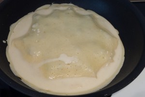 Eine weitere Suppenkelle Teig in die Pfanne geben, auf einer Seite backen, wenden. Die nächsten Schritte sollten möglichst schnell erfolgen: