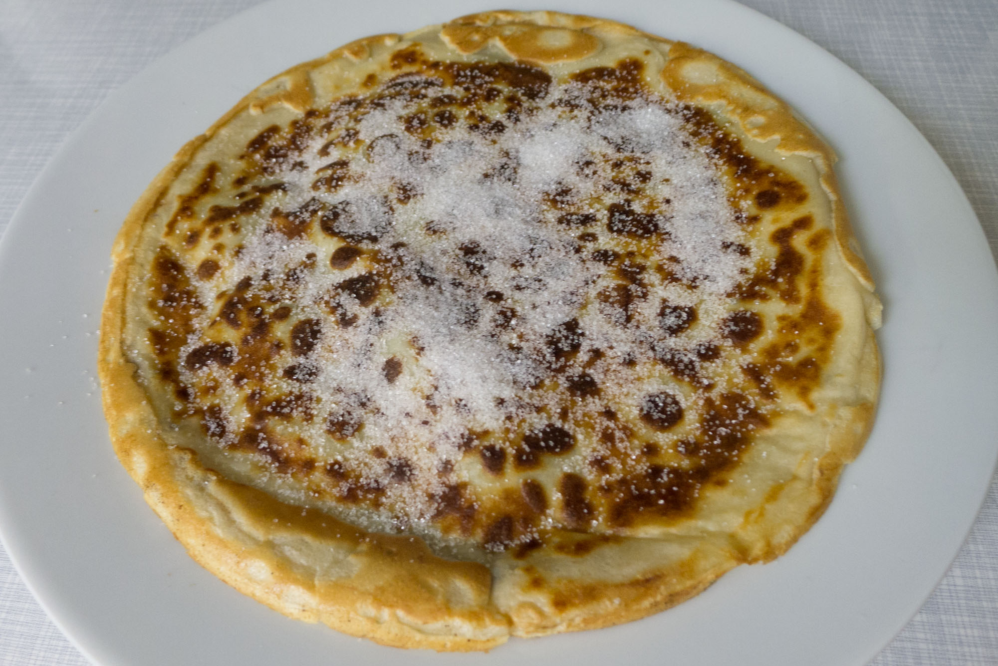 Dieser Teig sollte gestockt sein, bis die Unterseite des unteren Pfannkuchens gebräunt ist. Danach alles vorsichtig wenden (dieser Pfannkuchen ist eher nicht für ein Luftsalto geeignet) und fertigbraten. Auf einen Teller geben, mit dem Süßungsmittel der eigenen Wahl und in gewünschter Menge bestreuen oder begießen und genießen.