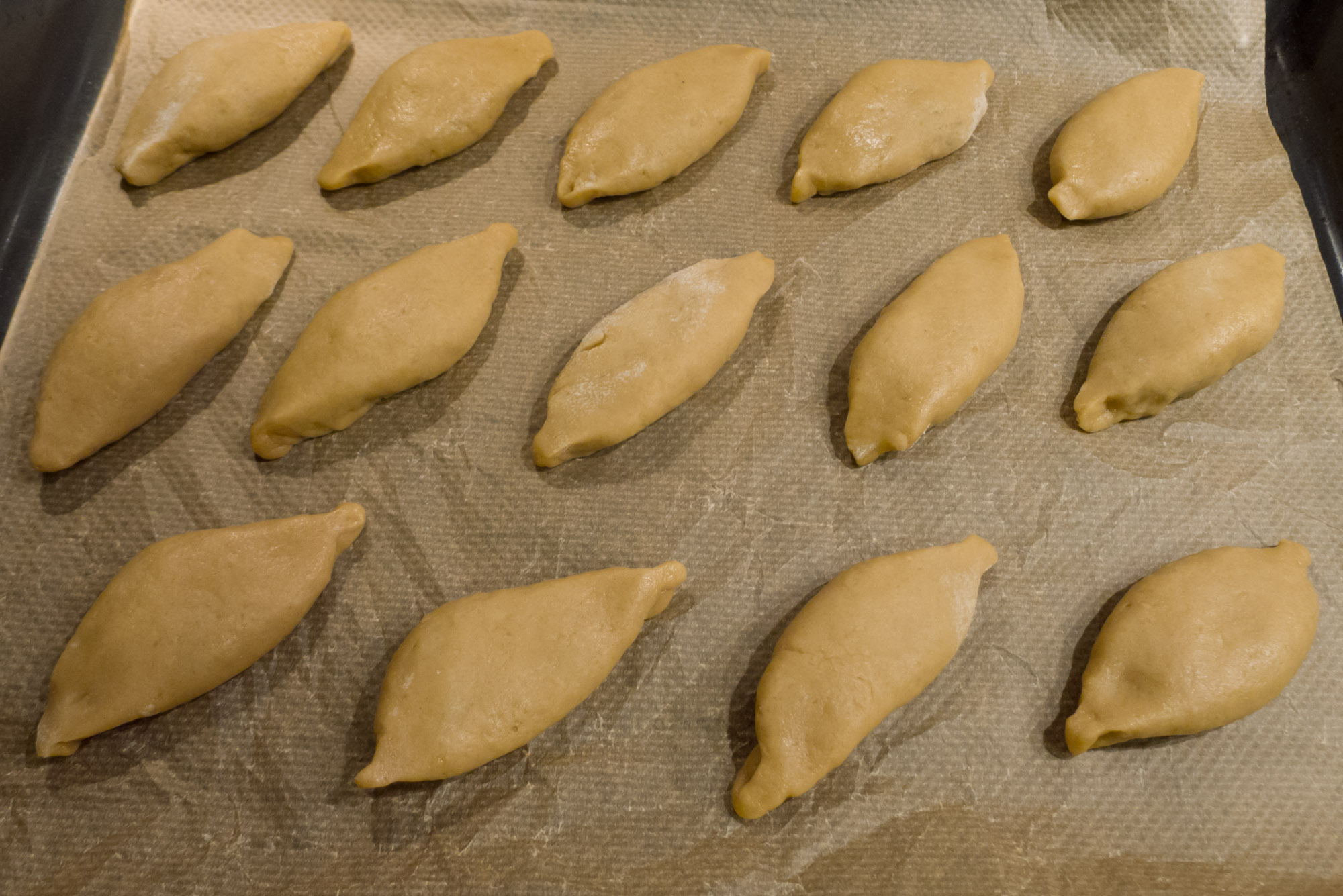Die Piroschki mit der Naht nach unten auf ein Backblech geben (wichtig, sonst bleiben sie beim Backen nicht geschlossen). Bei 200°C ca. 15 min backen.