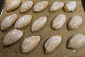 Am Backtag: Zunächst trennt man ein Ei. Das Eigelb kommt später in den Teig. Aus dem Eiweiß wird unter portionsweiser Zugabe von feinem Zucker (oder Puderzucker) eine dickflüssige weiße Glasur hergestellt. Es geht dabei nicht darum ein luftiges Baiser zu schlagen, sondern den Zucker nahezu zum Auflösen zu bringen. Die fertige Glasur bis zur Verwendung kühlen.