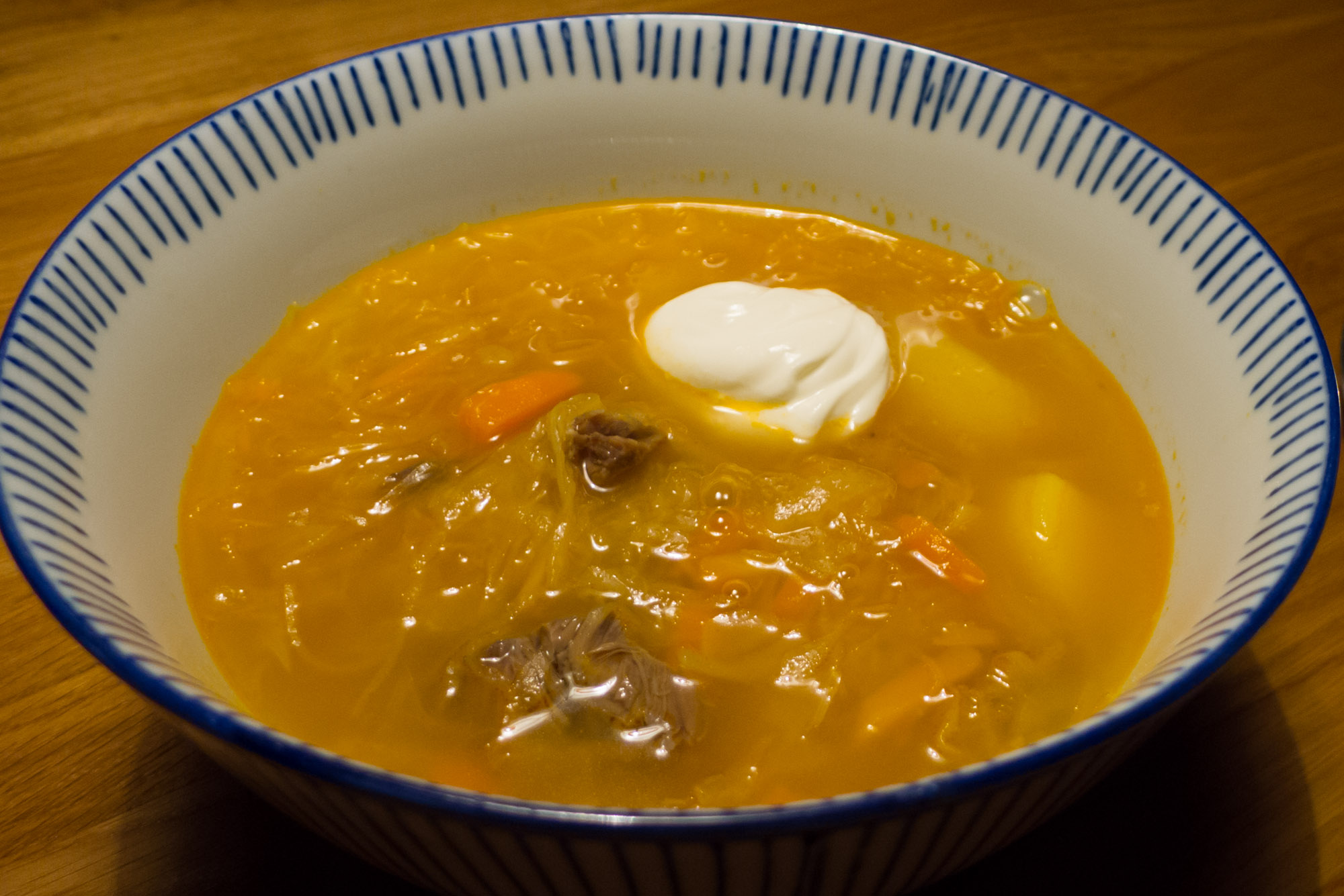Щи (Schtschi) ist mehr noch als Borschtsch eine (die?) tradionelle russische Suppenmahlzeit. Sie ist dabei im deutschen Sinne eher Eintopf als Suppe. Der Hauptbestandteil ist Kohl oder Sauerkraut, eine gute Fleischbrühe/Knochenbrühe ist ebenfalls von Nöten. In meiner Kindheit gab es einen Sauerkrauteintopf, den wir Sure-Komst-Borscht nannten. Ich habe nur dumpfe Erinnerungen daran. Ob es sich dabei um eine Art Щи handelte weiß ich nicht. Ich habe mich mit der Idee eines Sauerkraut-Eintopfs im allgemeinen und den Щи im speziellen nun schon mehrere Winter lang herumgetragen und einiges herumexperimentiert, war aber nie vollends zufrieden. Diesen Winter hat Сталик Ханкишиев (Stalic Khankishiev) mich mit seiner Version auf ganz neue Ideen gebracht. Und das Ergebnis ist wirklich die Mühe Wert – wahres Soulfood.