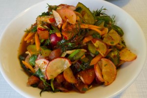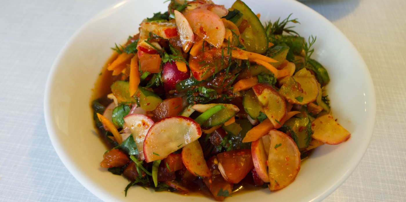 Gemüse und Kräuter waschen, putzen und dann entsprechend schneiden: Radieschen in dünne Halbkreise, Gurken in etwas gröbere Stücke, die Karotte in dünne Stifte, die Tomaten würfeln. Die Frühlingszwiebel in 5 cm lange Abschnitte schneiden und dann längs aufschneiden (die weißen Anteile etwas feiner, die grünen Einteile höchstens einmalig). Den Knoblauch würfeln. Dill und Koriander von groben Stielen befreien und sehr grob hacken. Die Zutaten in eine Schüssel geben und gut miteinander vermischen, am besten mit der Hand – vor allem aufgrund der Chiliflocken ist das Tragen von Handschuhen sehr zu empfehlen. Nun etwas festdrücken, abdecken und über Nacht bei Zimmertemperatur durchziehen lassen (vor direkter Sonneneinstrahlung schützen). Vor dem Servieren gut durchrühren und in eine Schale umfüllen.