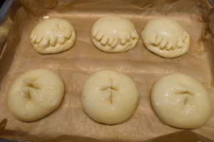 Die Brötchen erneut dünn mit Eggwash bestreichen und wenn gewünscht einschneiden. Dafür benetzt man am besten eine Schere mit Eggwash. Wer will, bestreut die Brötchen noch mit Hagelzucker. Nun kommt das Blech in den Backofen.