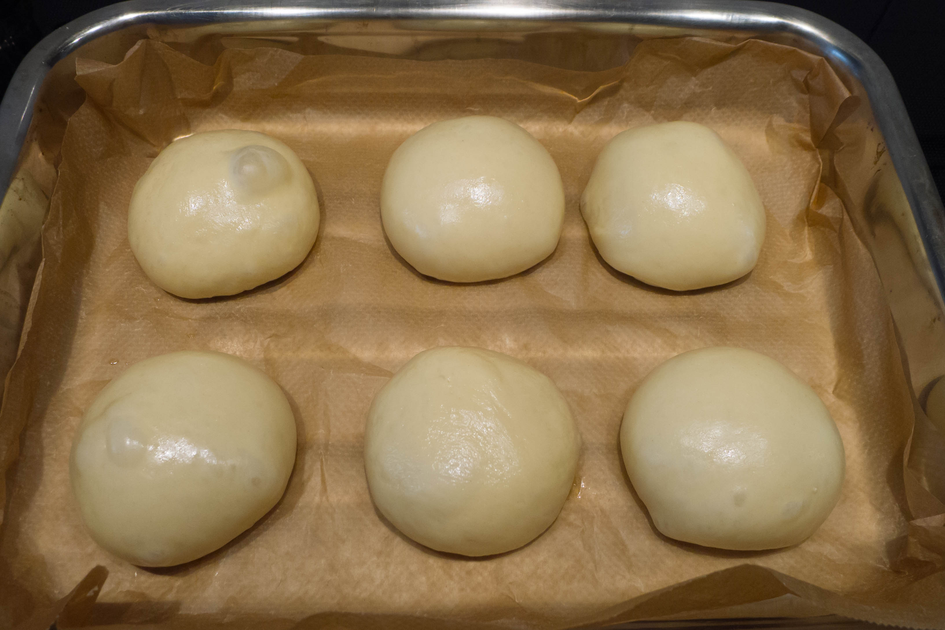 Die Teigkugeln dünn mit verquirltem Ei/Eggwash bestreichen und abgedeckt ca 1,5 Stunden gehen lassen, bis sie sich sichtbar vergrößern.