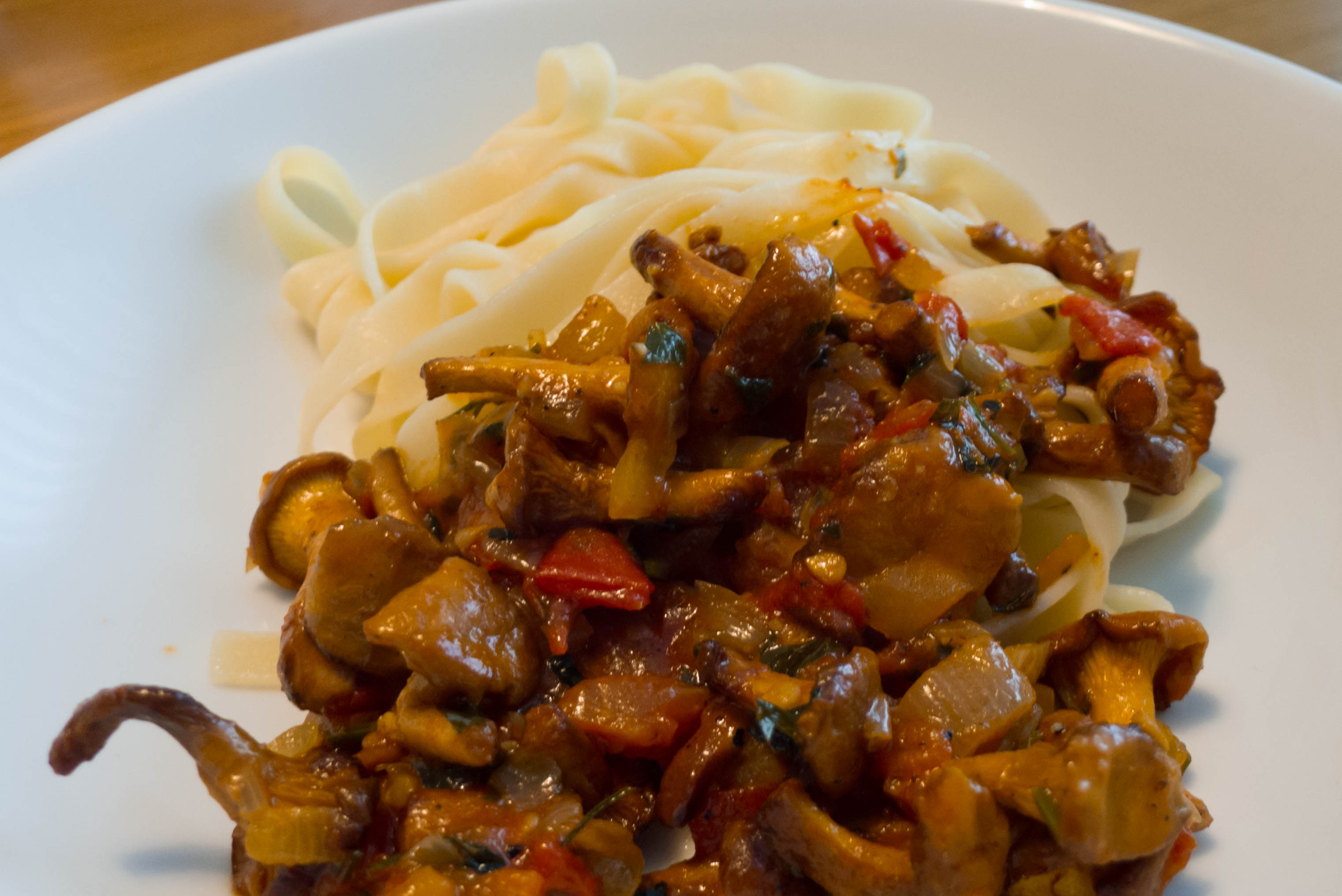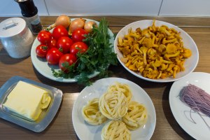 Die Tomatenwürfel, Salz, Pfeffer und fein geschnittene Petersilie hinzugeben und bei geschlossenem Deckel ca. 15 Minuten schmoren lassen. Dabei ab und zu umrühren und wenn nötig, die verdampfte Flüssigkeit mit Wasser auffüllen. In der Zwischenzeit Nudeln nach Packungsanleitung kochen. Kurz vor dem Servieren das Tomatenragout abschmecken, die restliche Butter unterrühren und die gebratenen Pfifferlinge unterheben. Das Ragout bei geringer Hitze und geschlossenem Deckel etwa 2 Minuten ziehen lassen (und die Pilze dabei erwärmen lassen). Sevieren und genießen.