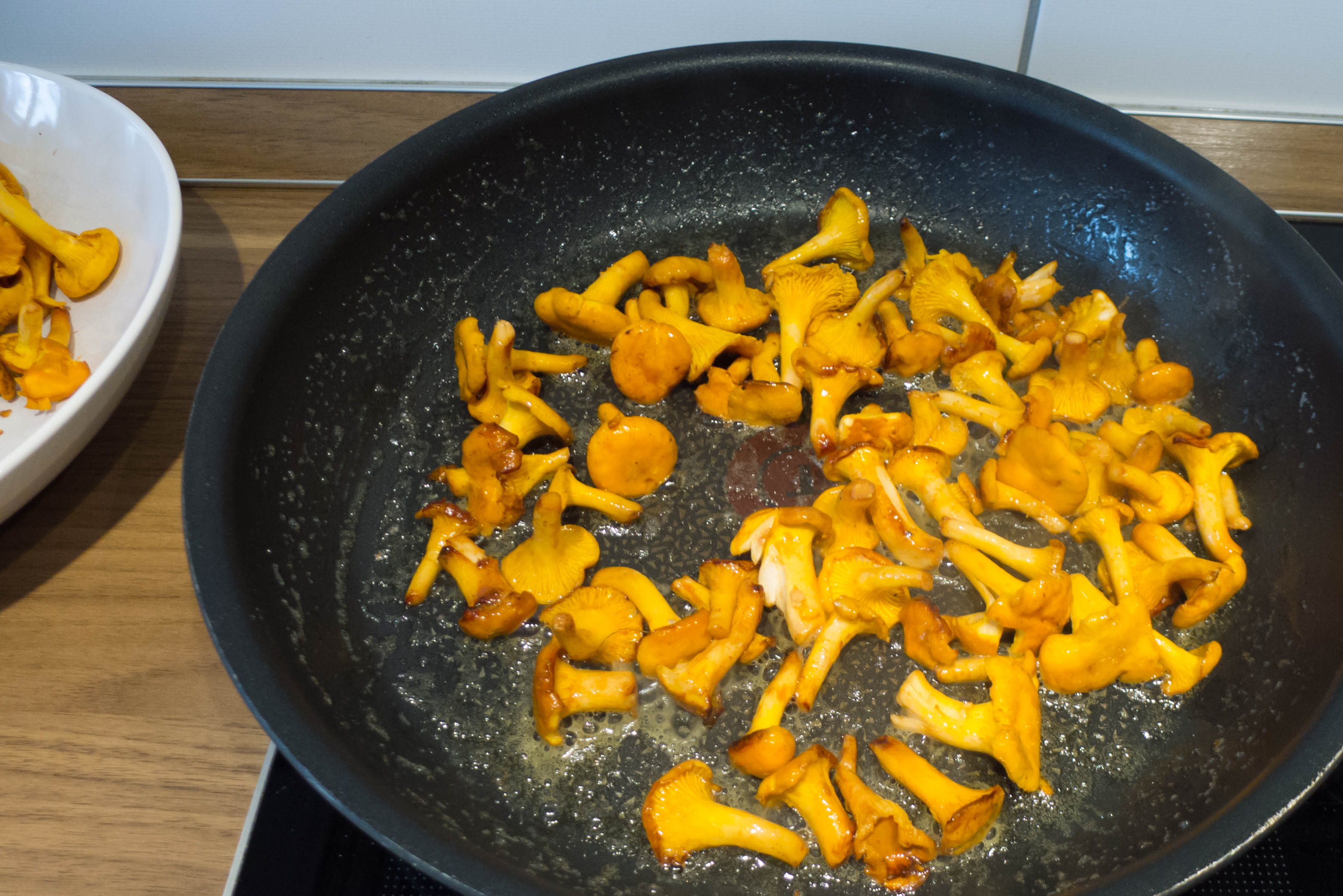 Wer beschlossen hat, die Pfifferlinge zu waschen: sie müssen erst gründlich trocknen, sonst lassen sie sich nicht braten.