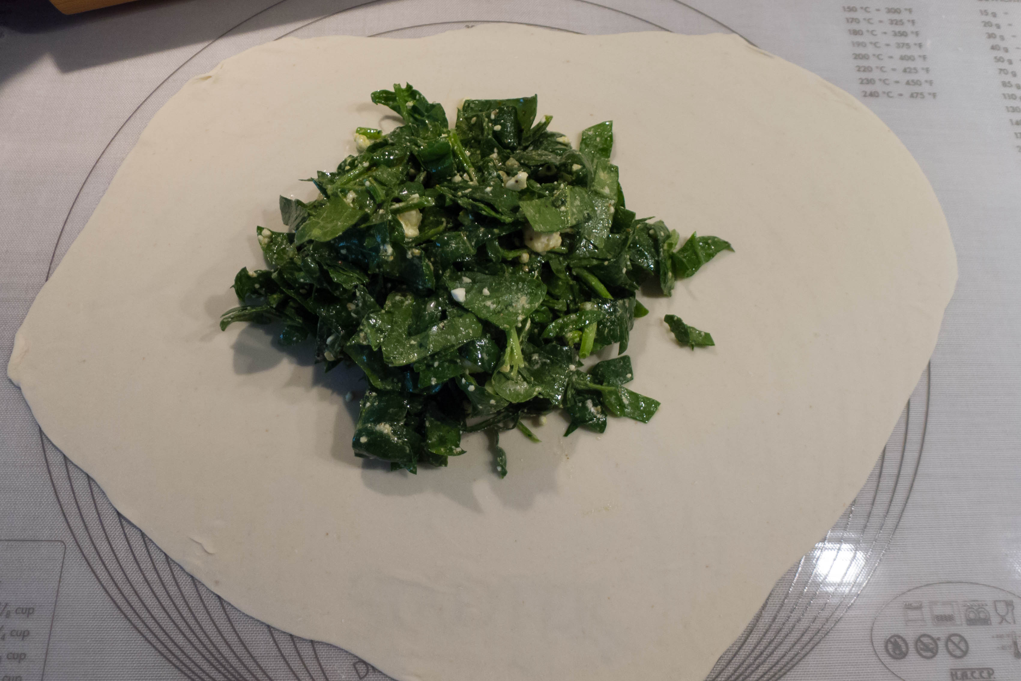 Eine der Teigkugeln unter Zuhilfenahme von Mehl so dünn wie möglich ausrollen (Musa Dagdeviren verlangt einen Kreis von 40 cm, ich war mit meinen ca. 30 cm bereits sehr zufrieden). Die Pfanne am besten in der Zwischenzeit bereits gut durchwärmen (bei mir hat sich die Herdeinstellung 7.0 von 9.5 als gut herausgestellt). Die Gözleme erst füllen, wenn die Pfanne warm genug ist. Falls der ausgerollte Teig etwas liegen bleiben muss, überprüfen dass er nicht an der Unterlage festklebt. Etwa einen Viertel der Füllung auf den Teigfladen geben und ihn von allen vier Seiten etwas überlappend einschlagen. Dabei alles zusammen etwas festdrücken.