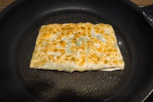 Etwas Öl in der Pfanne verteilen, damit sie gut benetzt ist. Gözleme hineingeben und etwa 3-5 Minuten braten.