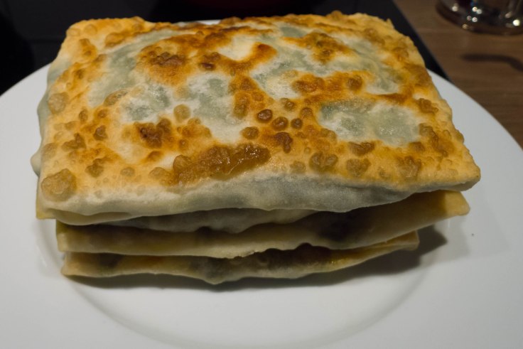 Was den Teig betrifft, habe ich sehr viele sehr verschiedene Rezepte gesehen. Die meisten haben lange Zutatenlisten und verlangten erstaunlicherweise auch nach – zum Teil beträchtlichen Mengen – Hefe. Das verwunderte mich sehr, denn die Gözleme, die ich so gerne esse, sind bestimmt ohne Hefe zubereitet. Deswegen hielt ich mich an das absolut simple Rezept von Musa Dagdeviren aus seinem The Turkish Cookbook, ein ähnliches Rezept wurde auch in einem von mir besuchten hiesigen Kochkurs verwendet.