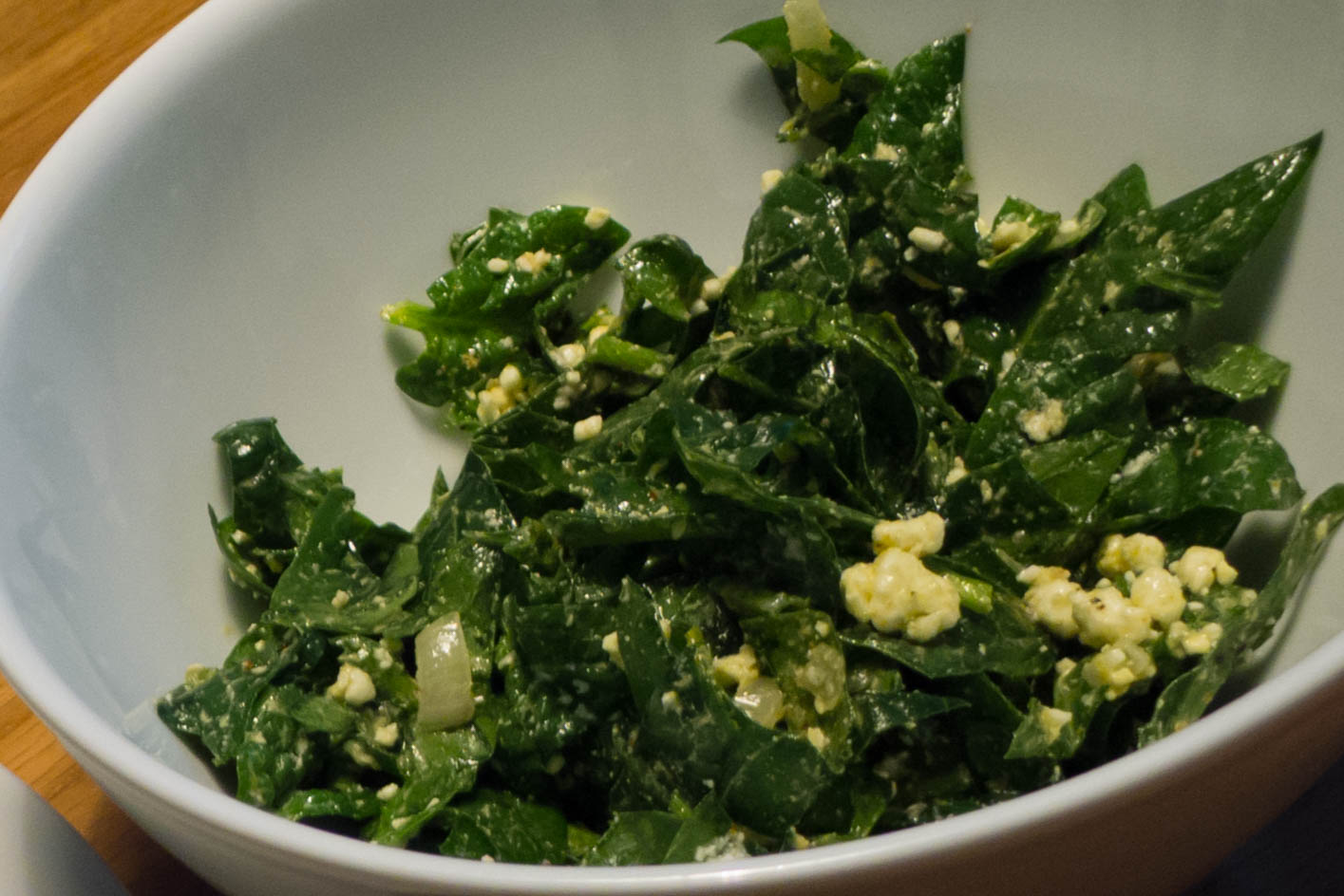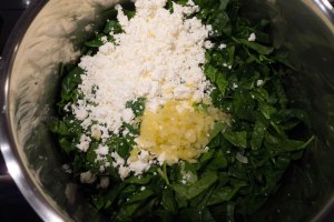 In der Zwischenzeit die Zwiebel fein würfeln und mit der Butter in einer kleinen Pfanne auf kleiner bis mittlerer Flamme anschwitzen bis die Würfel glasig werden. Den Spinat in Streifen schneiden und in eine große Schüssel geben (oder einen großen Topf). Den Feta mit den Händen fein zerreiben und zum Spinat geben. Die zwischenzeitlich etwas abgekühlten Zwiebeln mitsamt der Butter zum Spinat geben.