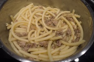 Danach oder in der Zwischenzeit Makkaroni/Maccheroni (lange Nudeln ein- bis zweimal brechen) gar kochen. In diesem Fall dürfen die Nudeln nicht mehr al dente sein, sondern sollten wirklich gar werden (wenn möglich jedoch noch nicht zerfallen). Die Nudeln abgießen, dabei etwas Nudelwasser auffangen. Die Fleisch-Zwiebel-Mischung in den Topf zu den Nudeln geben – in den meisten Fällen ist die Pfanne nicht groß genug um alles zu fassen – und gut durchmischen.