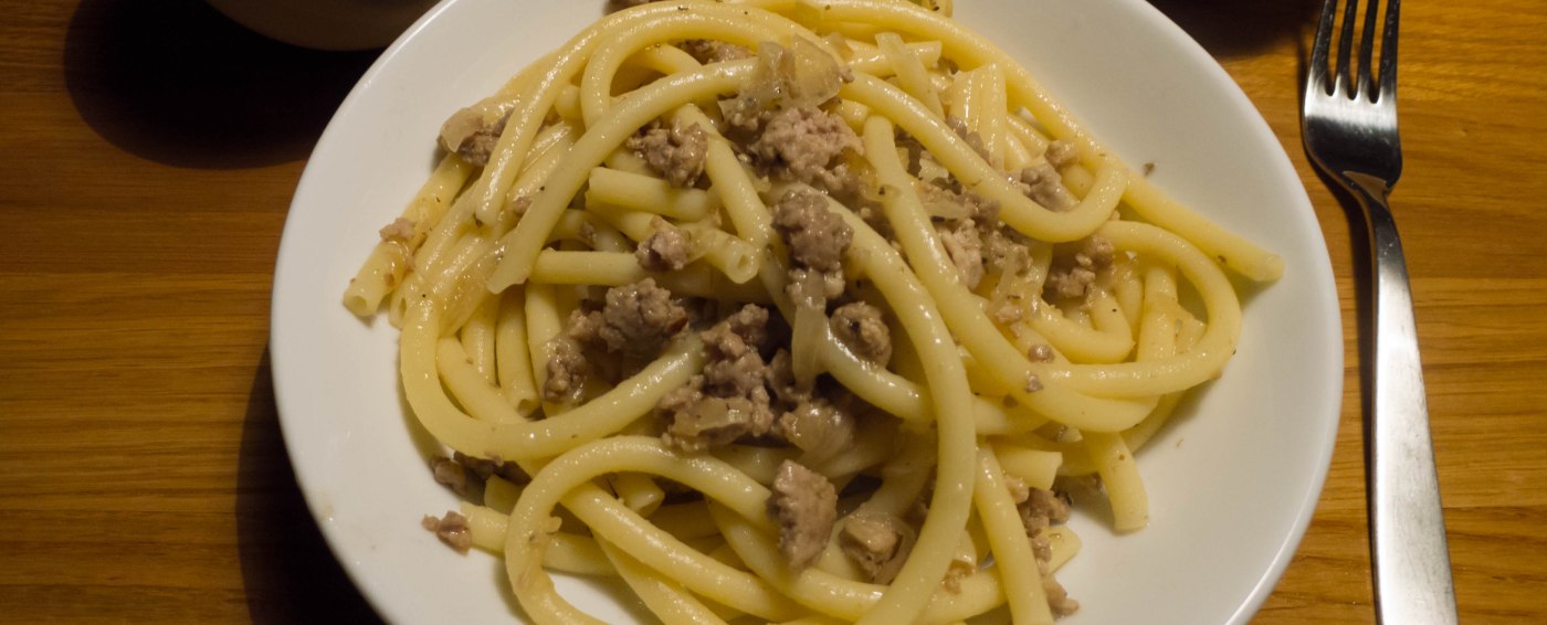 Die Makkaroni für dieses Gericht sind die klassischen langen Röhrennudeln, die tatsächlich sinnvollerweise hierfür ein- bis zweimal gebrochen werden sollten, alternativ und etwas weniger blasphemisch kann man allerdings die kurzen Maccheroni verwenden.