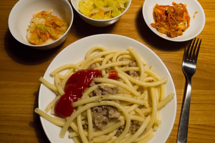 Übrigens mag auch mein Dauerversuchskaninchen (welches die Sowjetunion nie aus der Nähe gesehen hat und einige meiner kulinarischen Kindheitserinnerungen nicht nachvollziehen kann) dieses Gericht und findet, das Ketchup in diesem einen Fall seine Daseinsberechtigung in einem Nudelgericht hat.