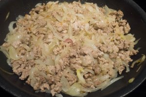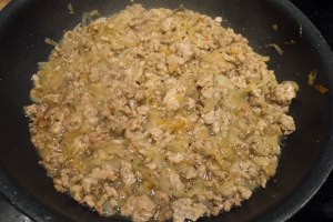 Zunächst die Zwiebeln schälen, in Streifen oder Scheiben schneiden und mit dem Öl in einer Pfanne bei mittlerer Hitze glasig schmoren. Dann die Hitze erhöhen, das Hackfleisch hinzufügen und beides zusammen etwas anbraten.