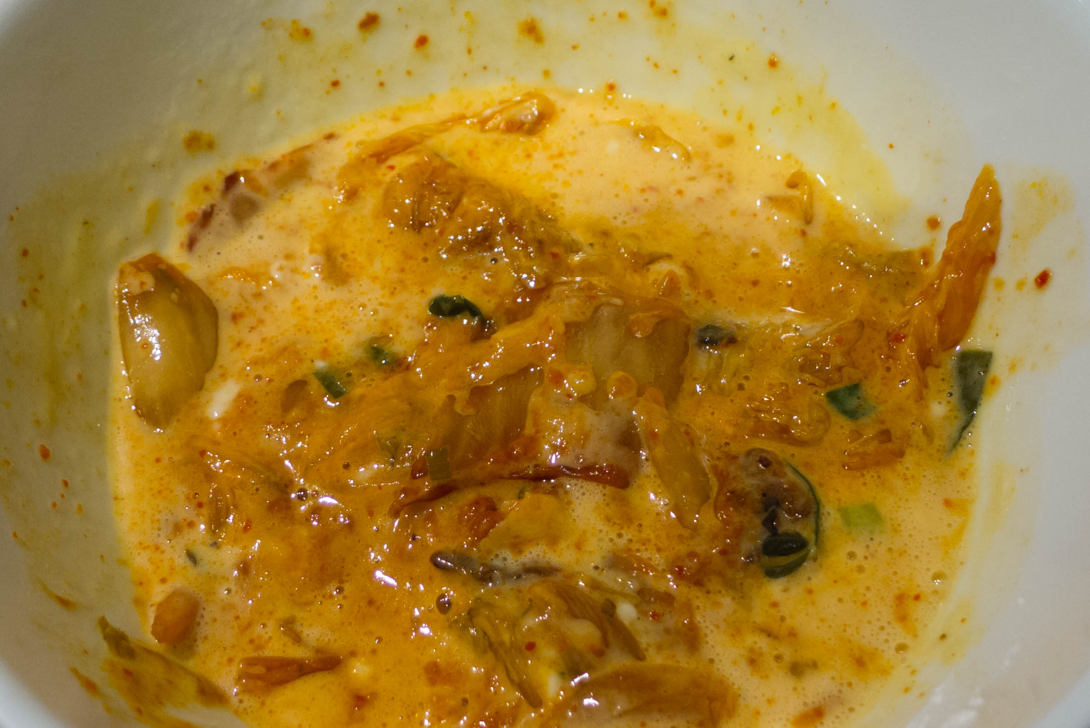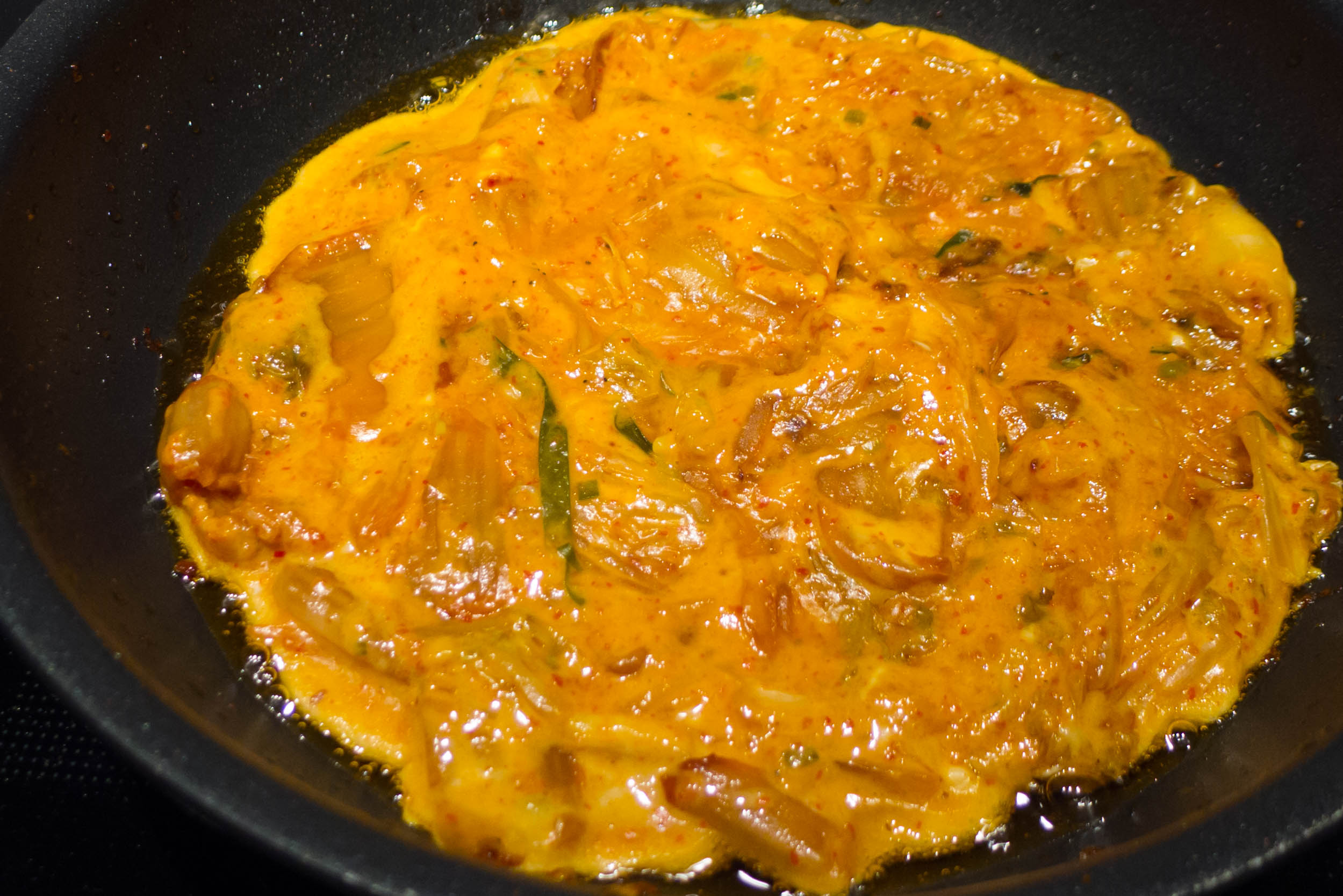 Das gebratene Kimchi unter den Teig rühren (es kann direkt heiß hinein und muss nicht vorher abkühlen).
