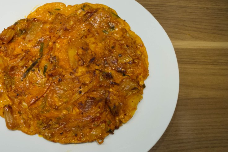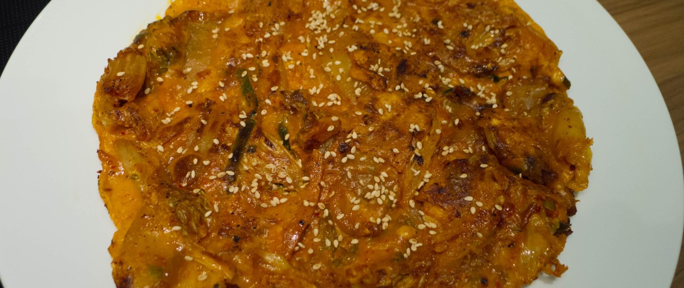 Ein Kimchi-Pfannkuchen ist schnell und einfach zuzubereiten und dabei super lecker. Er kann zu jeder Tages- und Nachtzeit zubereitet und konsumiert werden (vom Frühstück bis zum Betthüpfer am sehr späten Abend). In der Zubereitung ähnelt er sehr dem von mir vor Ewigkeiten geposteten Eierfladen-Rezept. Für diesen Pfannkuchen eignet sich vor allem saures/altes Kimchi aus Chinakohl, dabei muss es aber nicht unbedingt Dauer-Kimchi sein: ein zunehmend saurer Rest des frischen Kimchi kann hierfür auch perfekt verwendet werden.