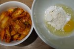 Das Ei mit dem Mehl, der Stärke, dem Wasser (oder Kimchiflüssigkeit) und dem Sesamöl in eine Schüssel geben und möglichst glatt rühren.