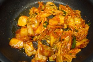 In einer Pfanne ein wenig Öl erhitzen und das Kimchi darin anbraten.