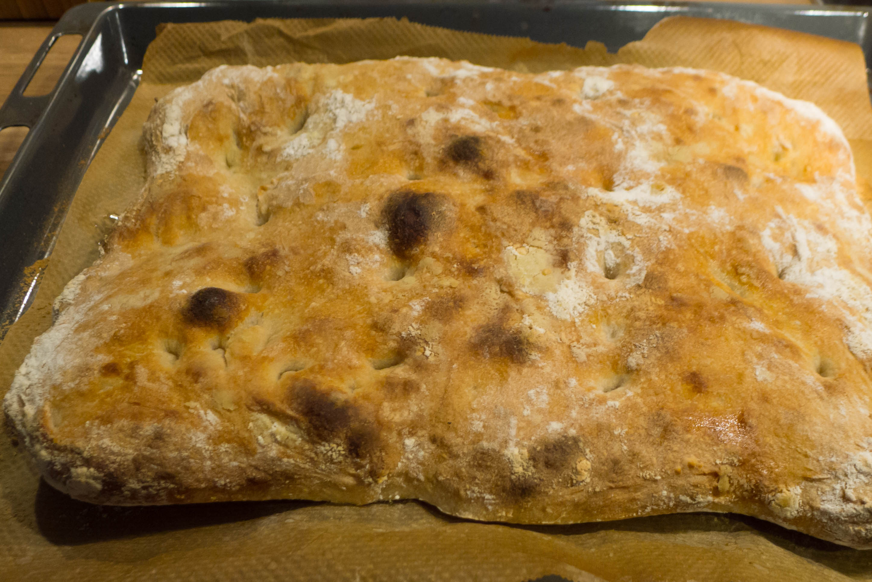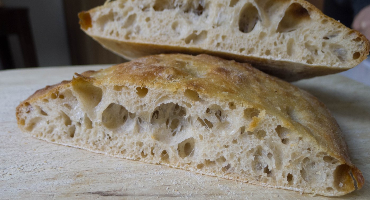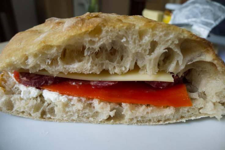 Sie sagt, dass sie das Rezept selbst erfunden hat, es aber vom Geschmack so sein soll wie in Florenz. Ich selbst war noch nie in Florenz und hatte bis vor Kurzem keine Ahnung, dass es ein Schiacciata überhaupt gibt. Somit erhebt weder sie, noch folgerichtig auch ich keinen Anspruch auf auch nur ein Mindestmaß an Authentizität. Dieses Brot nicht zu backen, wäre jedoch ein grober Fehler gewesen: es ist wirklich grandios und ein perfektes Sandwichbrot. Mein Dauertestesser ist sehr angetan. Mich erinnert der Geschmack an die großartige maltesische Ftira. Es ist auf jeden Fall ein Brot, das es bei uns nun häufiger geben wird. Da der Teig einen unheimlich hohen Flüssigkeitsgehalt hat und somit sehr klebrig und eigenwillig bleibt, ist das sicher kein Rezept für jemanden, der noch nie ein Brot gebacken hat und jetzt die unsinnig gehortete Frischhefe verbrauchen will. Wer allerdings etwas Erfahrung mit nassen Hefeteigen hat, sollte es bei Gelegenheit mal ausprobieren.