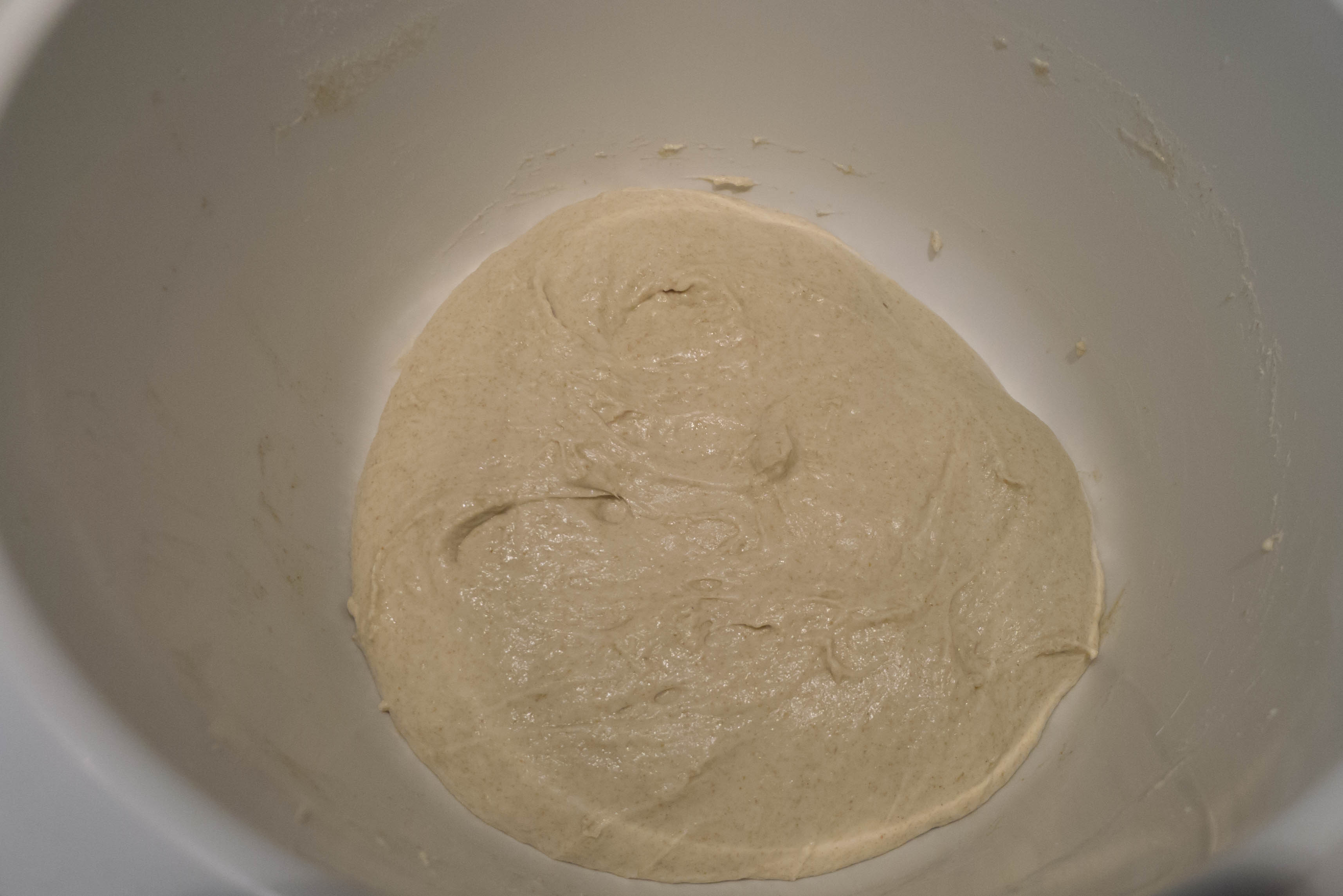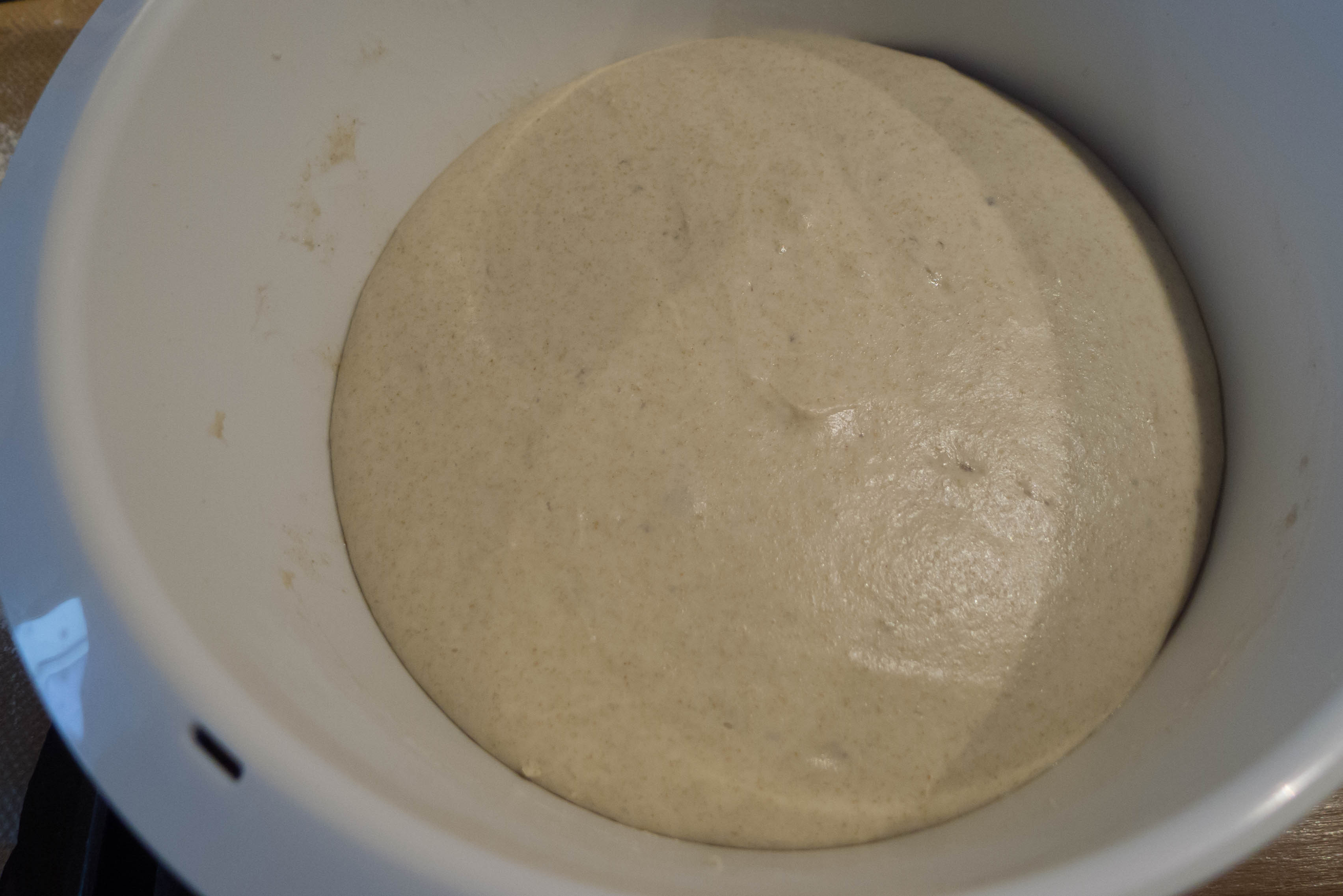 Das Wasser und den Joghurt in die Schüssel der Küchenmaschine geben und mit dem Teighaken etwas verrühren. Die Hefe unterrühren. Dann die vorher gesiebten Mehle und das Salz hinzufügen. Auf kleiner Stufe mischen, bis sich alle Zutaten verbinden. Dann auf hoher Knetstufe kneten lassen: Mandy spricht von 12-15 Minuten, nach denen sich der Teig vom Schüsselrand löst. In meinen mitterweile drei (jeweils erfolgreichen) Backversuchen war dieses Stadium auch nach gut 20 Minuten noch nicht erreicht. Der Teig blieb unheimlich klebrig. Da sich mein Teig jedoch mit einem Schaber sehr leicht vom Schüsselrand und Knethaken lösen lies, hatte ich es dabei bewenden lassen. Nun den Teig bei Zimmertemperatur an einem zugfreien Ort abgedeckt etwa 1,5 – 2 Stunden gehen lassen, bis er sein Volumen verdoppelt.