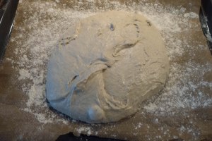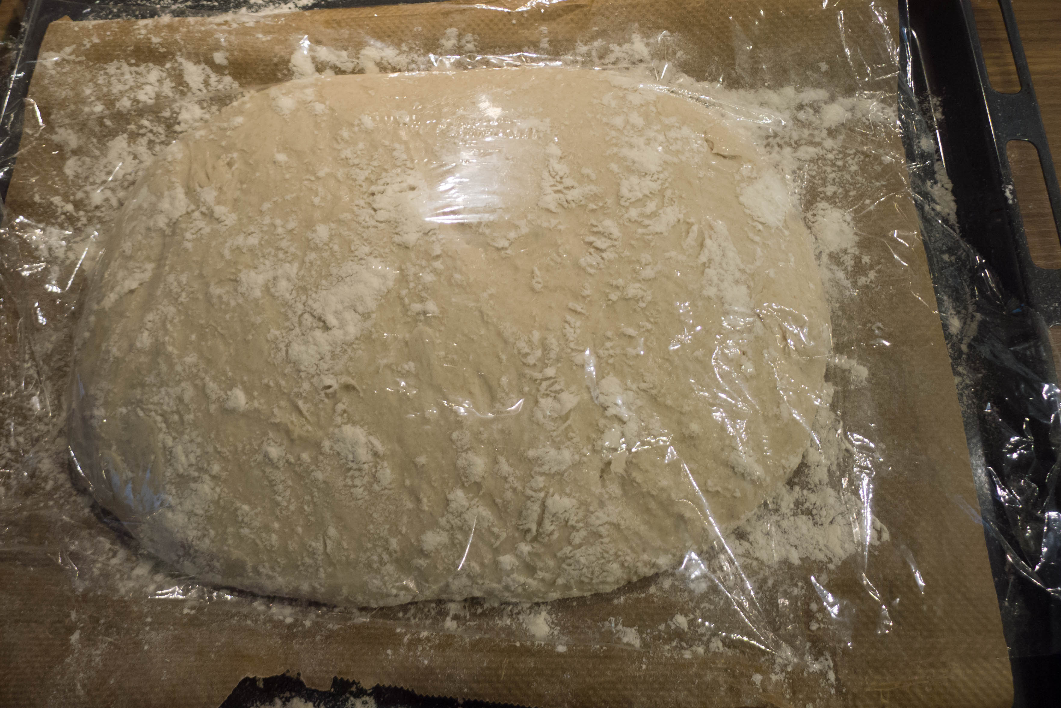 Den Backofen mit Umluft auf die höchstmögliche Temperatur einstellen und vorheizen lassen. Ein Blech mit einem Backpapier auskleiden. Mandy gibt (wohl zur besseren Haftung des Papiers) etwas Öl zwischen Blech und Papier – ich habe es nicht getan. Das Backpapier großzügig mit Mehl bestäuben und den Teig darauf geben.