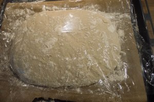 Die Plastikabdeckung vorsichtig entfernen (vor allem an den Stellen, wo sie trotz der kräftigen Bemehlung am Teig haftet). Den Teig erneut bemehlen und mit den Fingerknöcheln vorsichtig – mehr schiebend als drückend – auf dem Blech verteilen. Ziel ist dabei eine möglichst gleichmäßige Dicke von unter 2 cm.