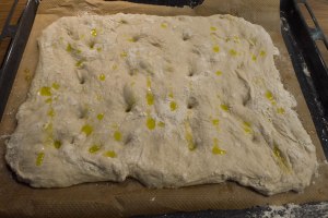 Am Schluss in Abständen von ca. 5 cm tiefe Eindrücke im Teig hinterlassen – dies soll verhindern, dass er sich beim Backen zu arg aufbläht. Den Teig fein mit Wasser besprühen (da ich keine Küchen-Sprühflasche besitze habe ich mit einer nassen Hand mehrfach Wasser über dem Teig verspritzt) und mit dem Olivenöl beträufeln.