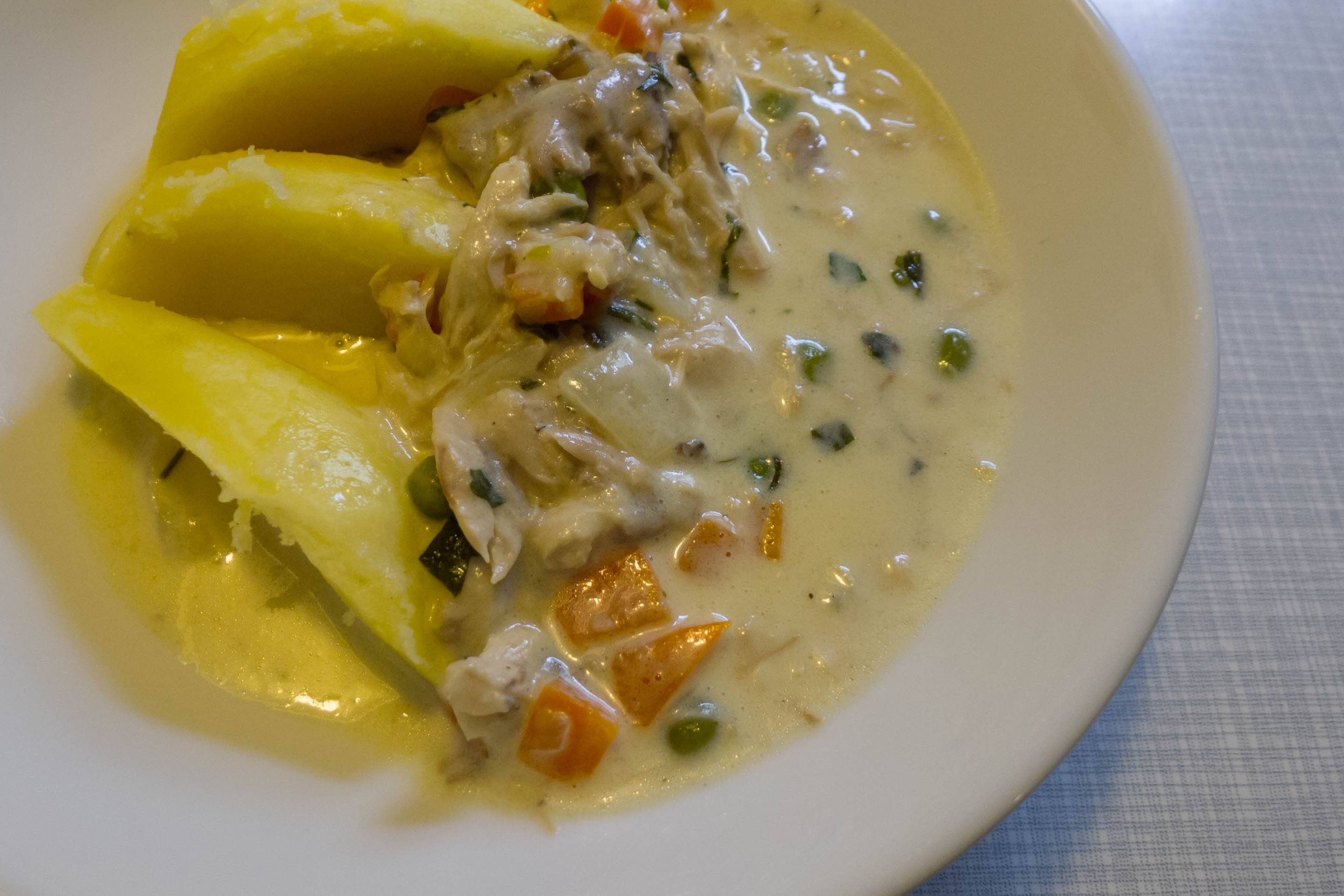Ich habe vor Jahren einen Beitrag geschrieben zu Gründen, warum ich ganze Hähnchen kaufe und Hühnerbrühe koche. Den dort von mir erwähnten Stadthofladen gibt es leider seit längerem nicht mehr, den lokalen Hof mit freilaufenden Gockeln gibt es allerdings weiterhin und die Gockel finden den Weg zu mir jetzt auf anderen Wegen. Beim Brühenkochen stellt sich mir immer wieder die gleiche Frage: was mache ich mit dem Fleisch, welches noch an den Karkassen dran ist? Ich habe bisher immer eine Verwendung dafür gefunden, mal in/auf einen Salat gegeben, in eine Ramen-Nudelsuppe oder diverse andere Dinge. Immer wieder hörte ich: aus dem Suppenhuhnfleisch bzw. gekochtem Hähnchenfleisch mache ich einfach Frikassee. Unter Frikassee stellte ich mir bisher (kantinengeschädigt) allerdings immer eine labberige Mehlschwitze mit seltsamer Konsistenz und wenig Geschmack vor. Während des letzten Brühekochens habe ich dann doch Rezepte für Frikassee gesucht und bin dabei sehr verschiedene Lösungen gestoßen. Die Rezepte aus den historisch-klassischen Hauskochbüchern wirkten auf mich nicht sonderlich appetitanregend, und die Bindung mit Ei kurz vor dem Servieren schien für mich keine Option (ich wollte schließlich nicht alles am gleichen Tag essen). Die heutigen Youtuber kochen für Frikassee gerne Hähnchenbrüstchen: das war somit auch kein Ansatz für mich. Tim Mälzer hat mal ein Rezept mit Legehennen-Schlegeln veröffentlicht und mir auch mit seiner sonstigen Herangehensweise an das Gericht hat er mir Appetit gemacht. Etwas verändert habe ich es letztendlich doch. Das Ergebnis: phantastisch! Kann auch gut eingefroren werden für ein schnelles Abendessen unter der Woche oder eine Mahlzeit am Arbeitsplatz.