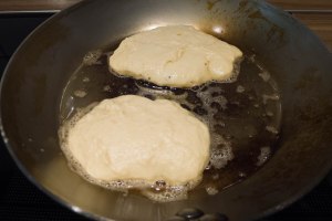 Auf mittlerer Hitze braten bis die Unterseite gut gebräunt ist. Dann einmalig wenden. Ggf. die Herdtemperatur etwas runterregulieren, wenn der Pfannkuchen schneller braun zu werden scheint, als zu garen. Bei dicken Pfannkuchen kann die Garheit an der dicksten Stelle mit einem Zahnstocher überprüft werden (trockener Zahnstocher = Pfannkuchen innen gar).