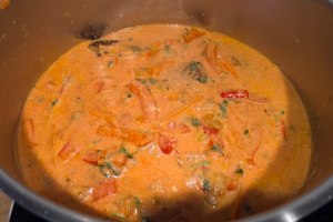 Dann mit dem übrigen Gemüsesaft ablöschen. Den Schmand hinzufügen und die Mischung aufkochen lassen. Die passierten Tomaten unterrühren und etwa 300 ml Wasser hinzufügen. Die Mischung aufkochen lassen. Petersilie, Salz, Pfeffer, Chilli und Lorbeerblätter unterrühren. Die Mischung über die Klöße geben. Dabei sollte die Flüssigkeit die Klöße am besten knapp bedecken.