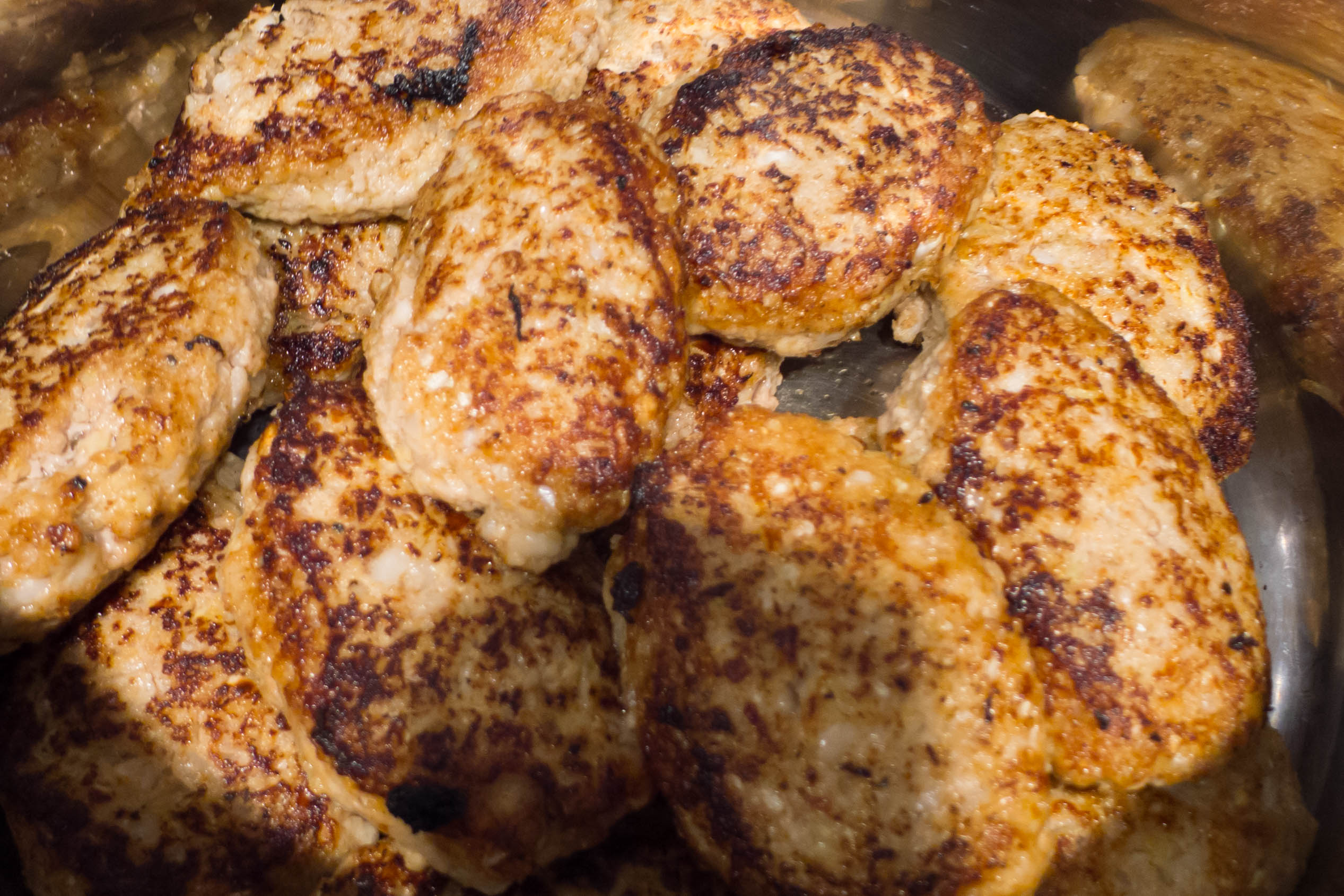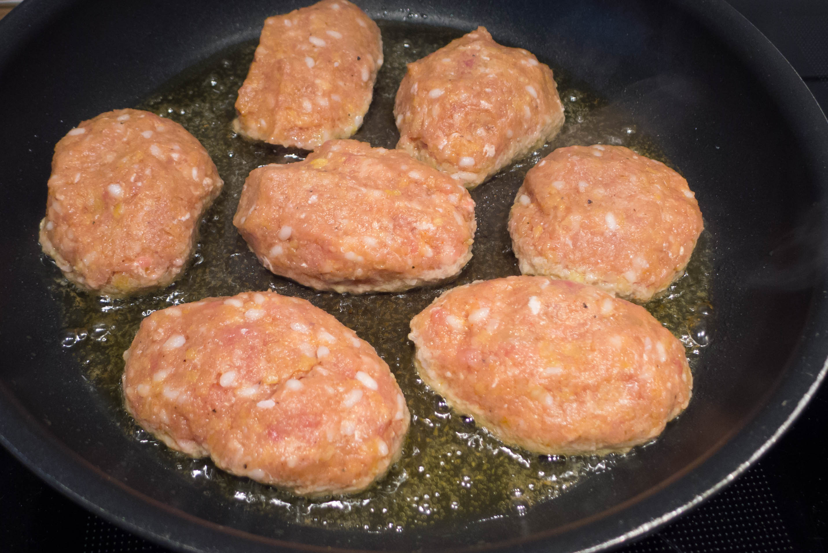 Nun auch den Reis zum Fleisch und Gemüse geben. Mit Salz und Pfeffer würzen (dabei bedenken, dass der Kohl bereits Salz in sich hat). Die Mischung gut durchkneten. Wenn sie dabei zu nass wirkt, ggf. noch etwas (Panier-) Mehl oder eingeweichtes Brot dazugeben. Wenn die Mischung zu trocken wirkt, etwas von dem Gemüsesaft hinzugeben. Aus der Mischung Klöße etwa in der Größe von Frikadellen/Bouletten – oder je nach Belieben. Nun diese in Butterfett oder einem hocherhitzbaren Öl von beiden Seiten scharf anbraten und in einen Topf schichten.
