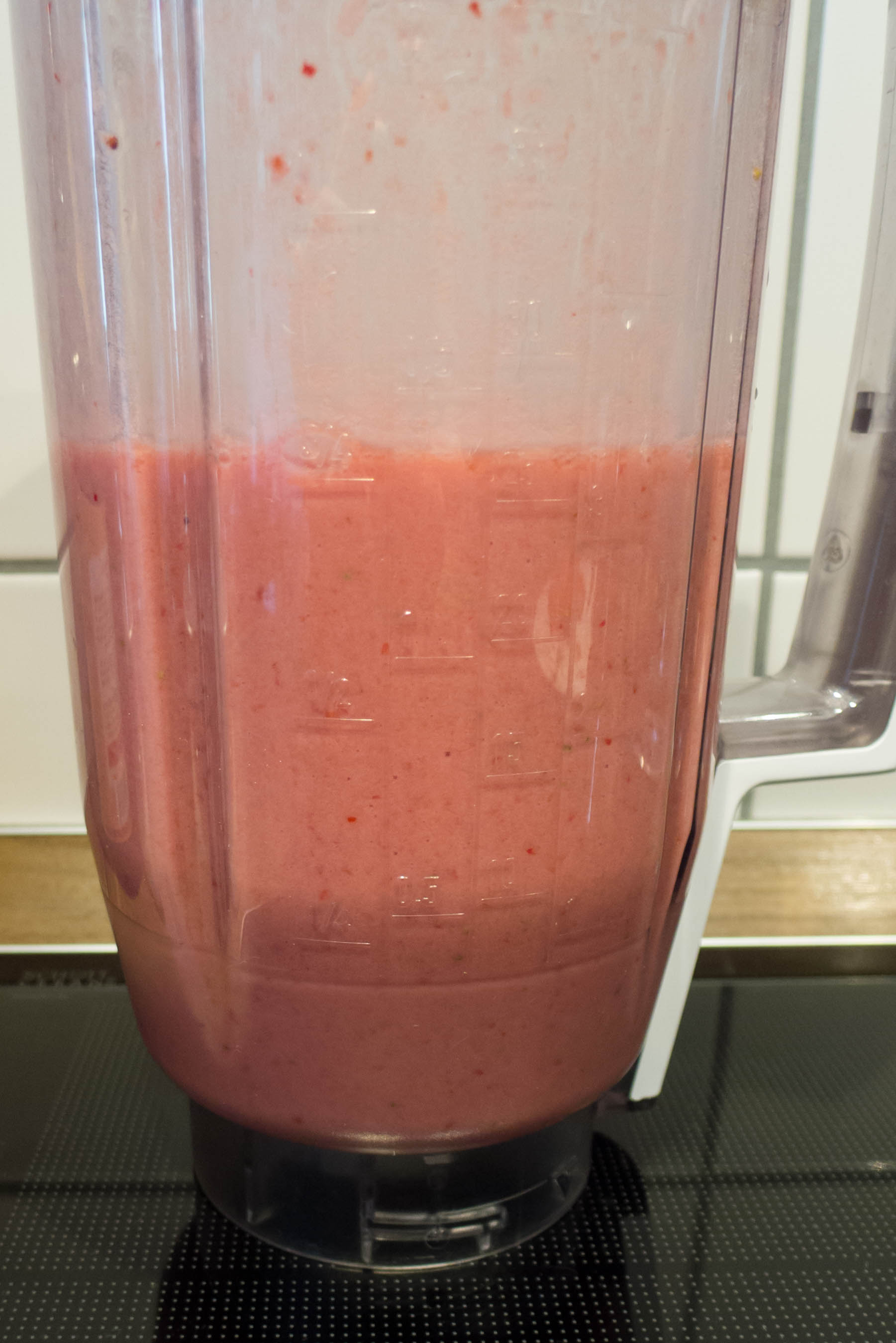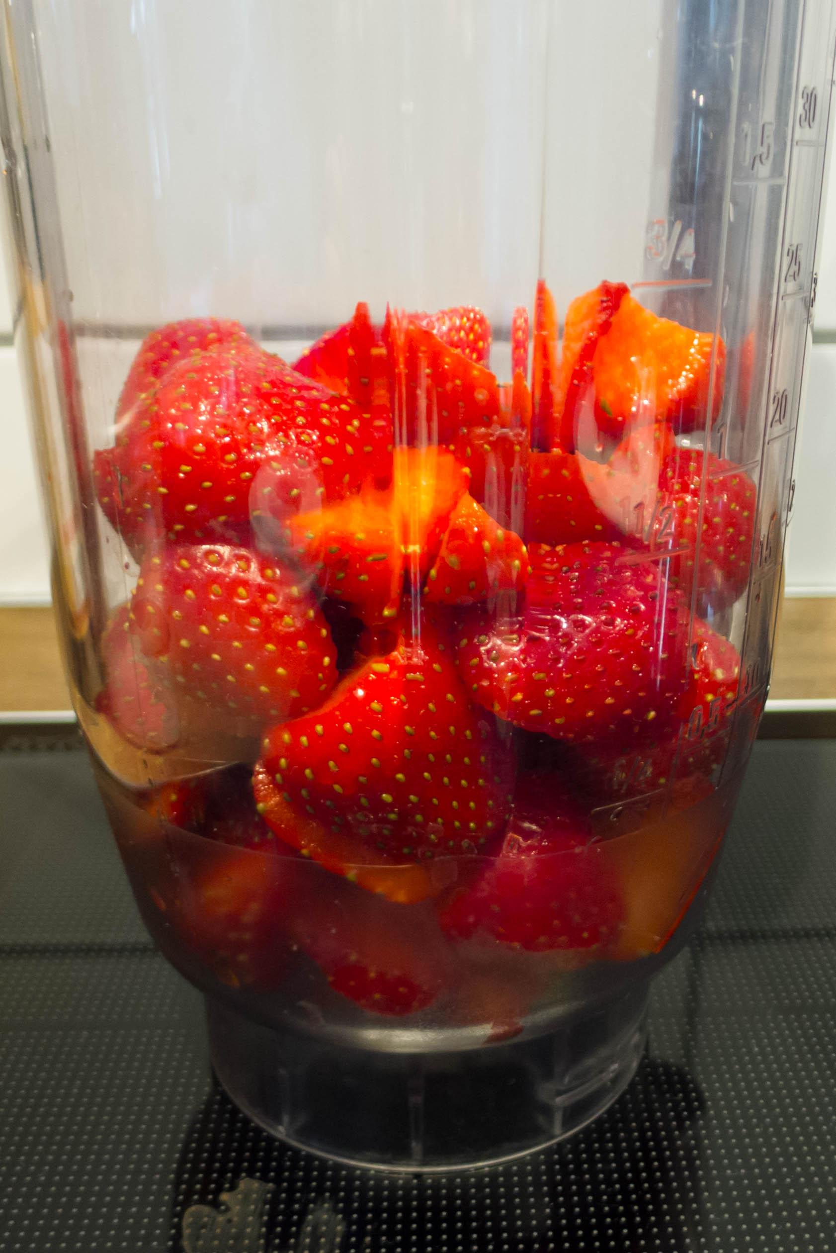 Die Erdbeeren grob schneiden und mit den übrigen Zutaten in einen Mixbehälter geben.