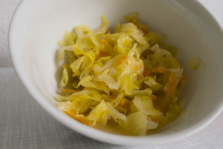 Mein heutiger Beitrag beschäftigt sich nicht mit einem warmen Sauerkrautgericht, sondern mit dem „rohen“ Sauerkrautprodukt. Ich hatte über Jahre immer wieder Versuche unternommen, Sauerkraut selbst herzustellen. Dieses gelang mir mal besser, mal schlechter. Im vergangenen Herbst habe ich etwa zeitgleich mit meinen ernsthafteren Kimchi-Experimenten auch angefangen, mich ernsthaft mit der Sauerkrautherstellung zu beschäftigen. Es ging mir dabei nicht um das in Deutschland sehr beliebte Weinsauerkraut, welches bereits für die Gärung mal mit Essig, mal mit Wein versetzt wird. Ich hatte Hunger auf Sauerkraut, wie ich es aus meiner Kindheit kannte: mit Zugabe von Karotten und Salz. Keine weiteren Zutaten oder Gewürze.