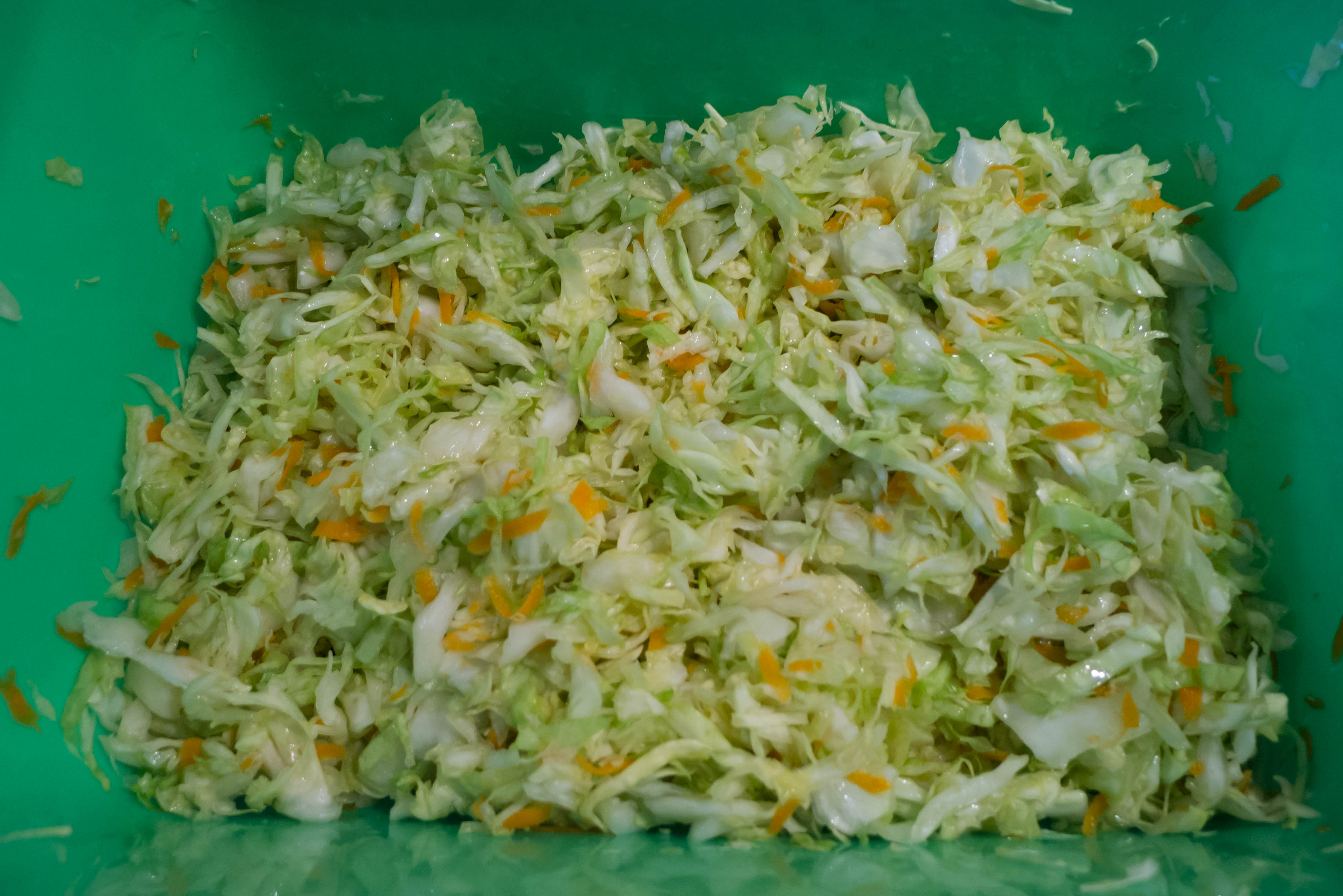 In der Zeit wird der Kohl anfangen zu „schwitzen“ und schon einiges an Saft abgeben. Nun geht es darum alles zusammen gut verkneten, damit der Kohl etwas weicher wird und noch mehr Saft abgibt. Je nach Weißkohlsorte, Saison und Lagedauer kann es dabei mehr oder weniger Saft geben. Falls der Kohl „zu trocken“ wirkt: schon mal Wasser mit Salz aufkochen und auf Zimmertemperatur abkühlen lassen (auf je 100 g Wasser 3 g Salz).