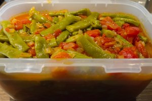Die Bohnen waschen, trimmen, wenn nötig Fäden entfernen und in mundgerechte Stücke schneiden. Das Bohnenkraut von den Stängeln zupfen. Tomaten mit heißem Wasser überbrühen und schälen. Wenn die Tomaten sehr wässrig sind, sollte mann sie entkernen, ansonsten einfach in Würfel schneiden. Die Zwiebeln schälen und fein würfeln.