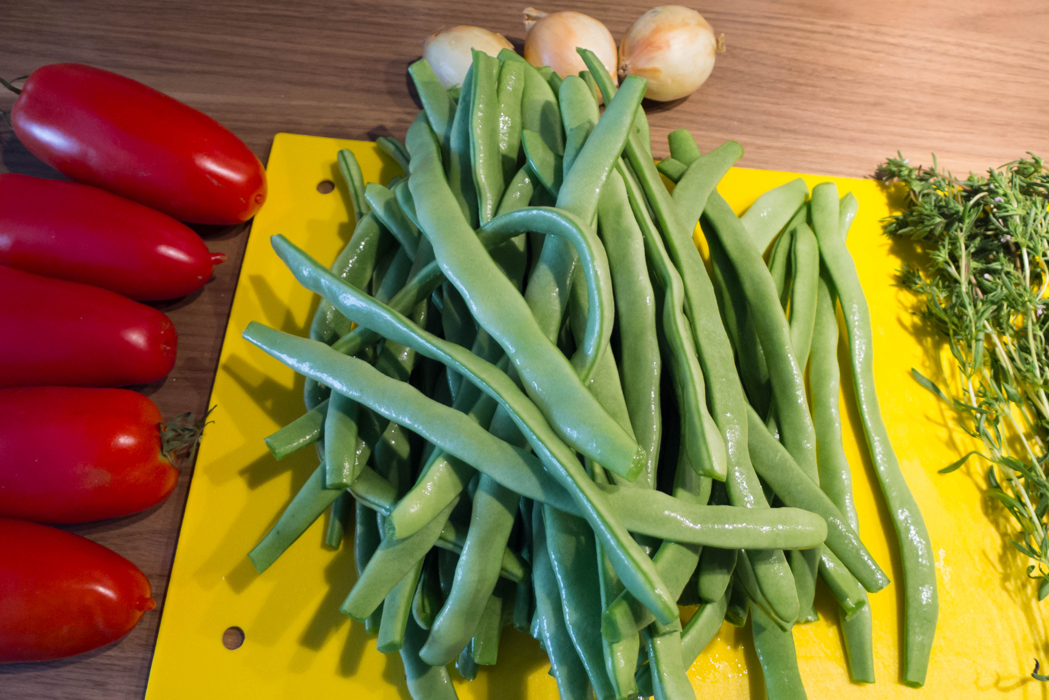 Die Bohnen waschen, trimmen, wenn nötig Fäden entfernen und in mundgerechte Stücke schneiden. Das Bohnenkraut von den Stängeln zupfen. Tomaten mit heißem Wasser überbrühen und schälen. Wenn die Tomaten sehr wässrig sind, sollte mann sie entkernen, ansonsten einfach in Würfel schneiden. Die Zwiebeln schälen und fein würfeln.