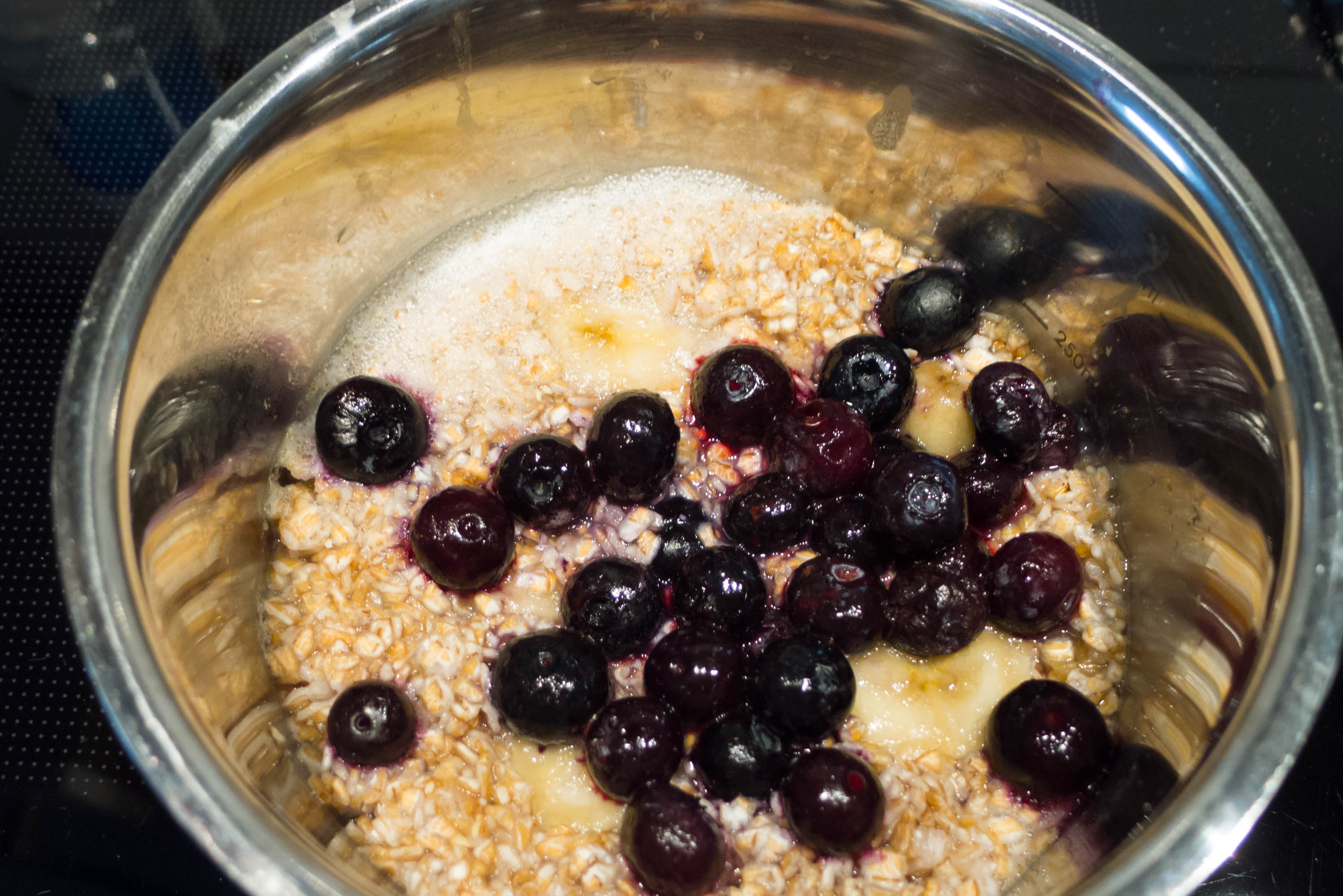 Wasser aufkochen, die in Würfel geschnittene Feige und die Flocken hineingeben, wieder aufkochen lassen. Die Bananenstücke unterrühren. Nach insg. 1 Minute Kochzeit, den Herd ausschalten. Blaubeeren dazugeben. Den Topf abgedeckt auf dem Herd etwa 10-15 Minuten quellen lassen.