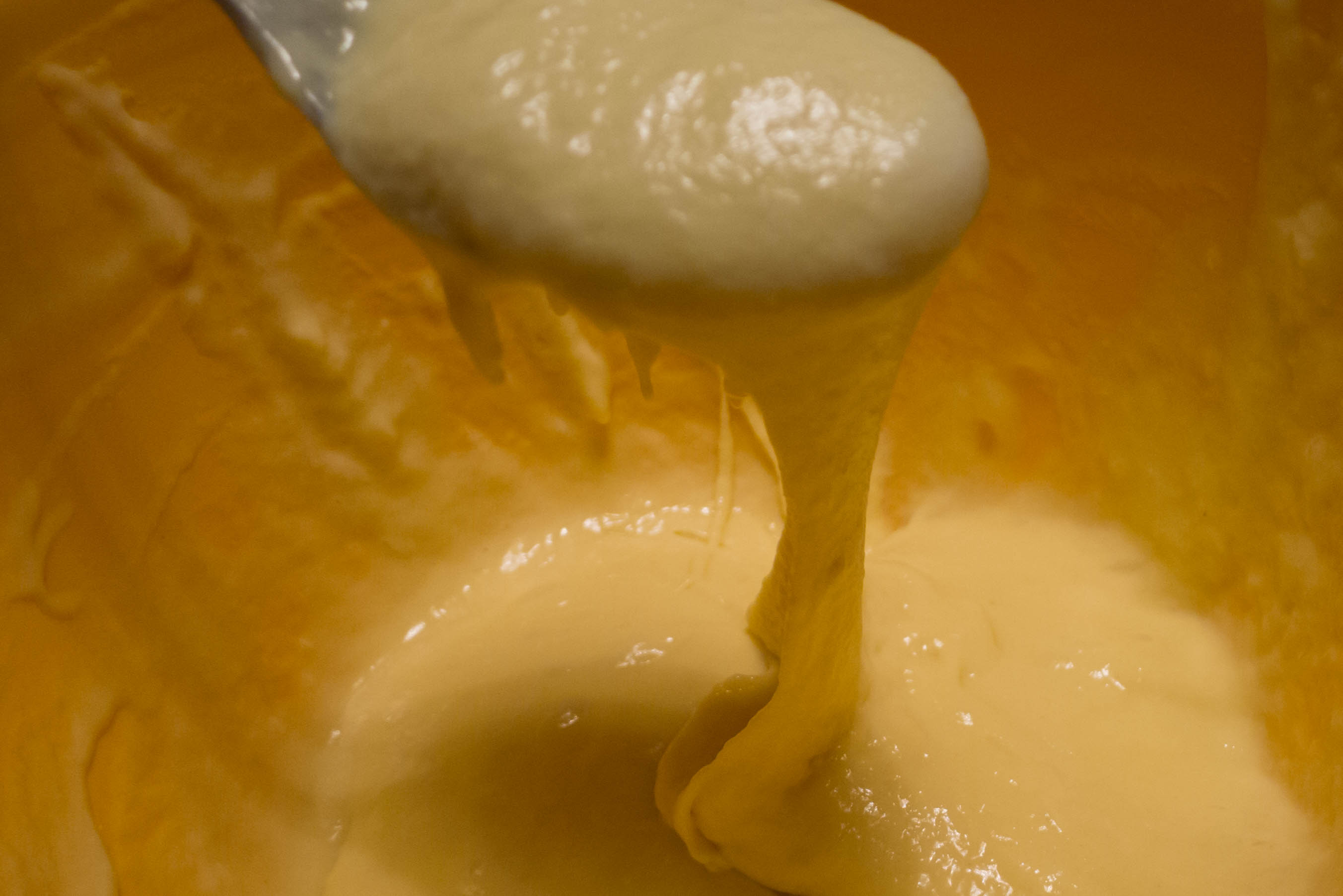 Die Butter im kleinen Topf schmelzen und etwas erkalten lassen. Die Milch handwarm erhitzen. Das Mehl in eine Schüssel geben, in die Mitte eine Mulde drücken. Den Zucker und die Hefe hineingeben, mit etwas warmer Milch vermischen. Kurz stehen lassen. Wenn eine Bläschenbildung anfängt, die restliche Milch, die Eier und das Salz in die Schüssel geben. Mit einem Löffel (oder einem anderen Hilfsmittel der Wahl) homogen verrühren. Butter unterrühren. Die Teigkonsistenz wird ein etwas zähflüssiger Pfannkuchenteig sein.