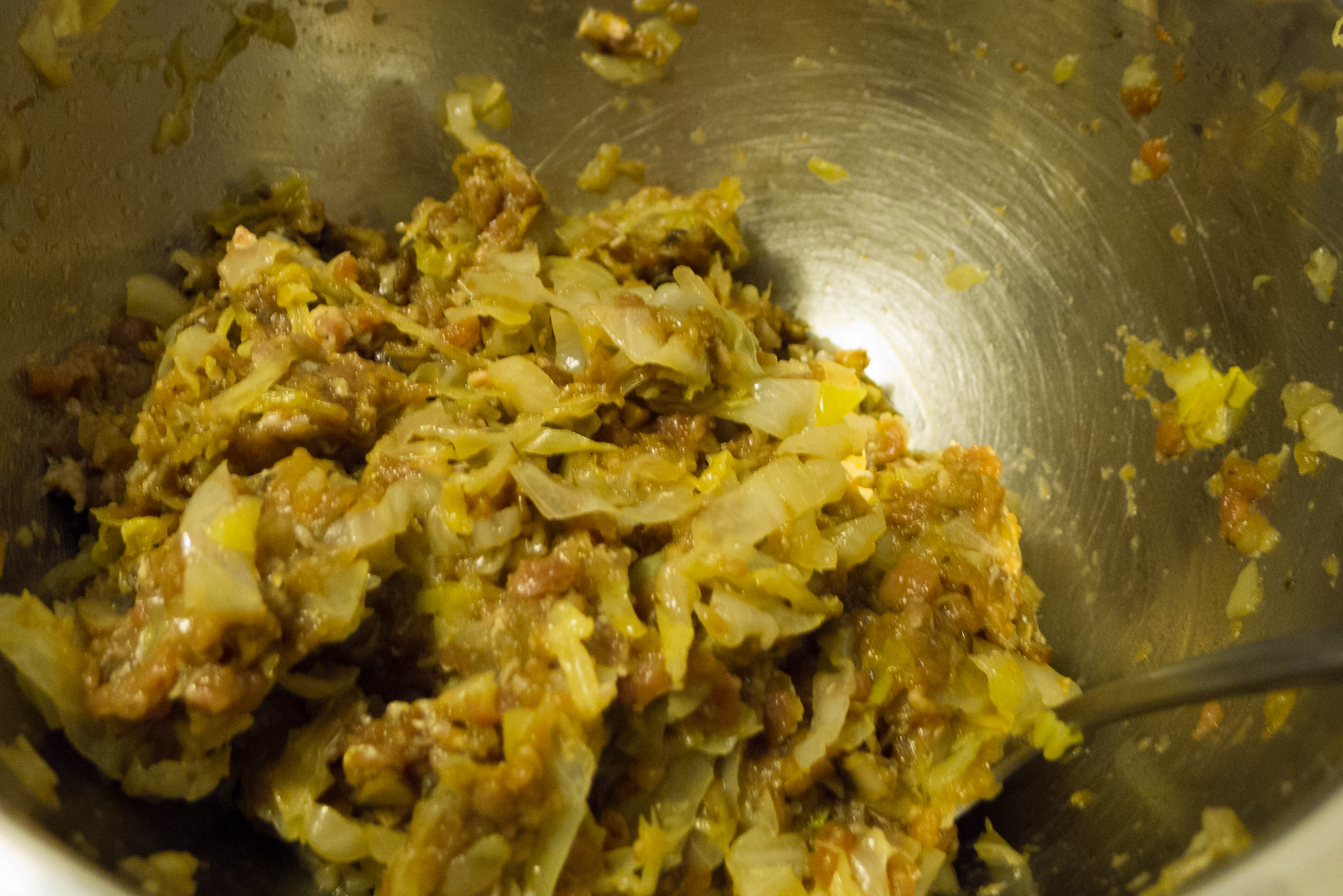 Das Fleisch und die Zwiebeln durch den Fleischwolf drehen. Stärke, Sojasauce, Reiswein, 1 TL Sesamöl dazugeben und gut miteinander verrühren. Sobald Pilze und Kohl abgekühlt sind, diese auch unter Fleischmischung rühren.