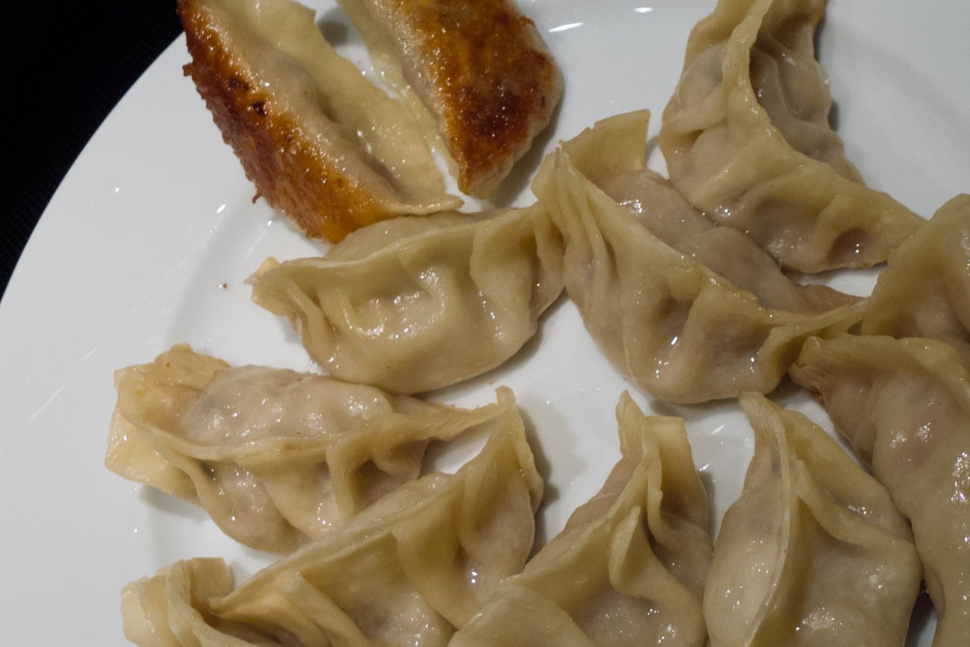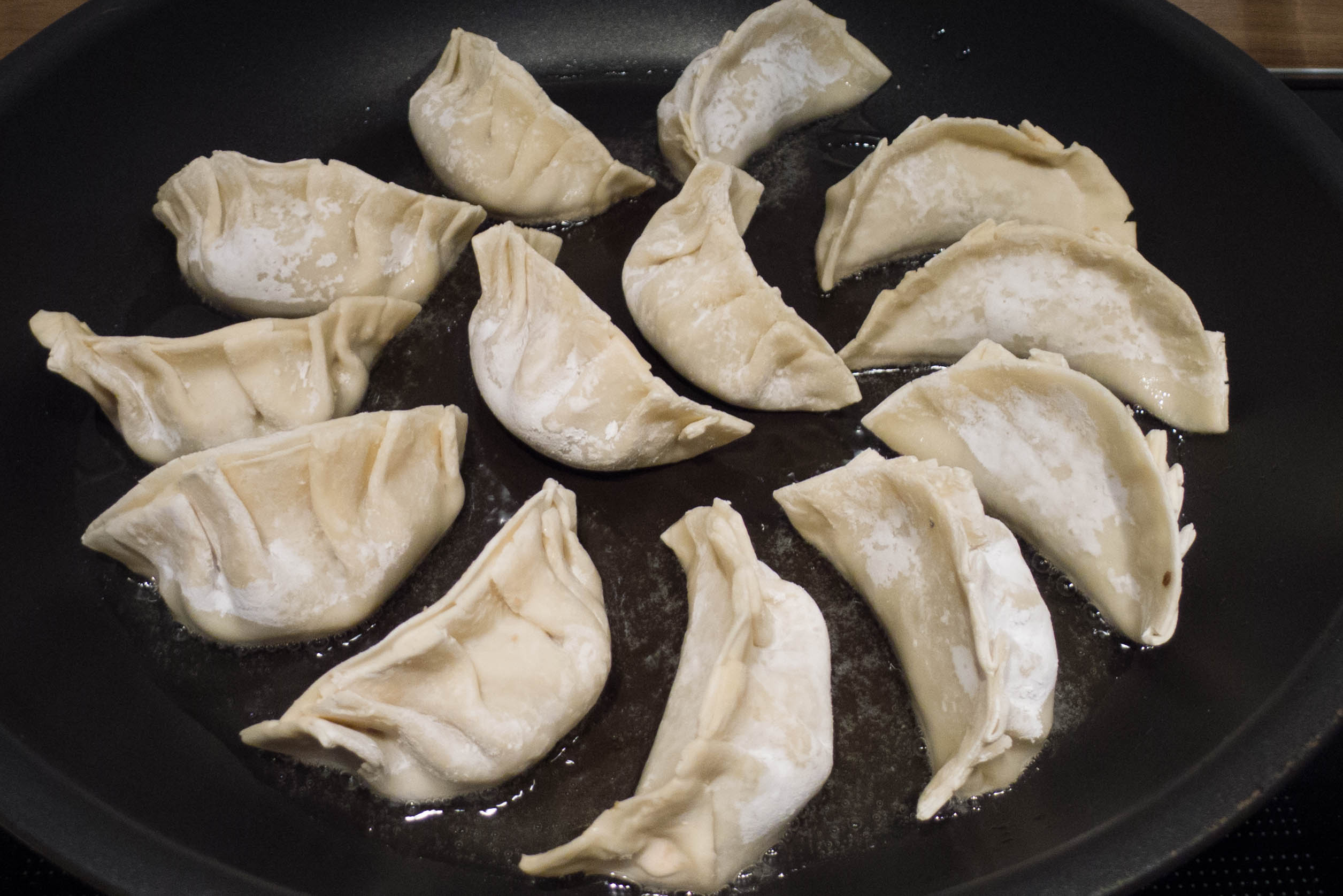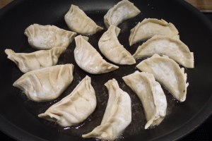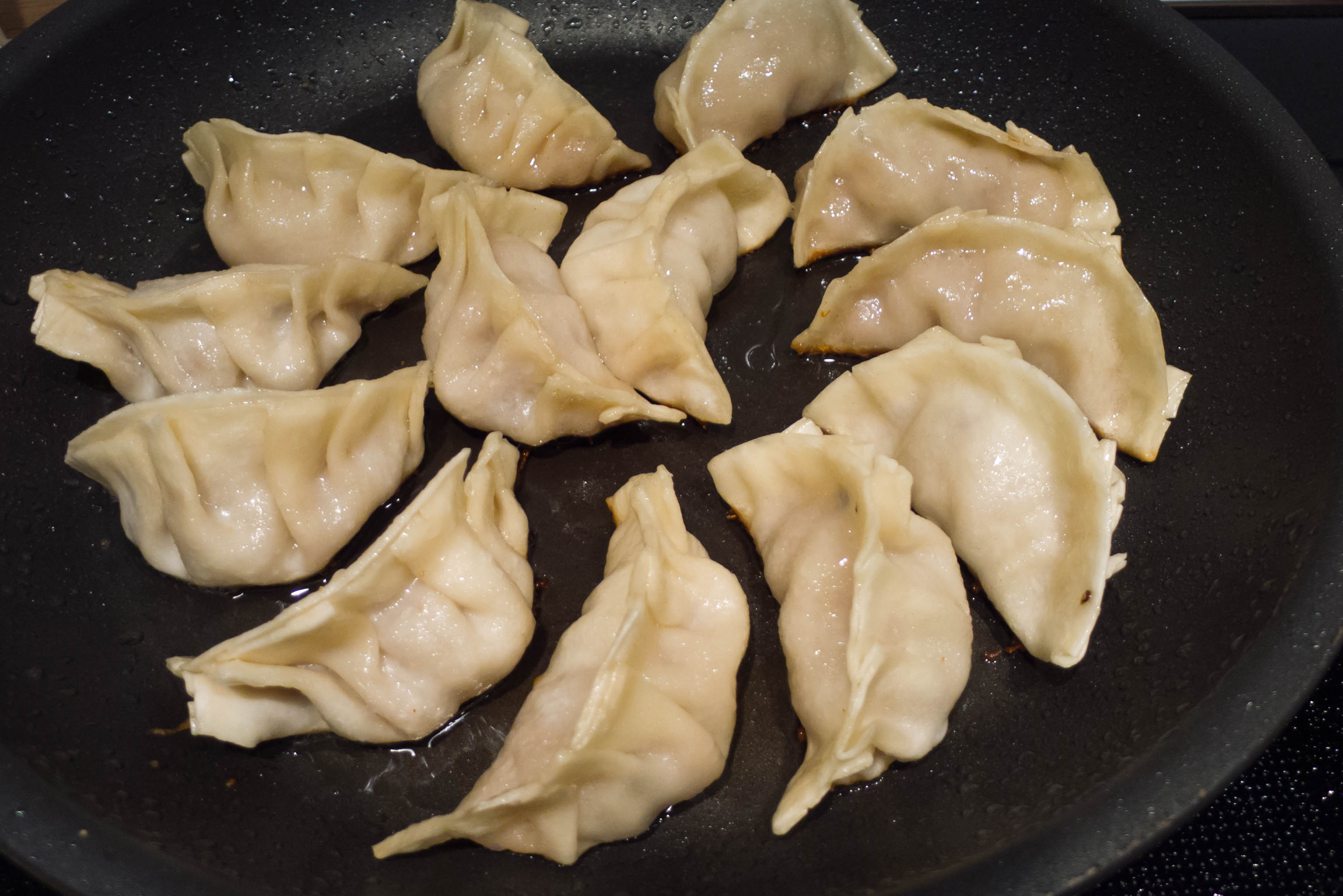 Sobald die Teigtaschen sich am Boden etwas bräunen, ca. 100 ml Wasser hineingeben und sofort den Deckel schließen. Auf mittlerer bis hoher Flamme die Teigtaschen etwa 10 Minuten garen lassen. Wenn das Wasser vorzeitig vollständig verdampft ist, einfach noch etwas nachgießen. Wenn zum Ende der Garzeit noch viel Flüssigkeit in der Pfanne verbleibt: Hitze erhöhen und den Deckel etwas schrägstellen.