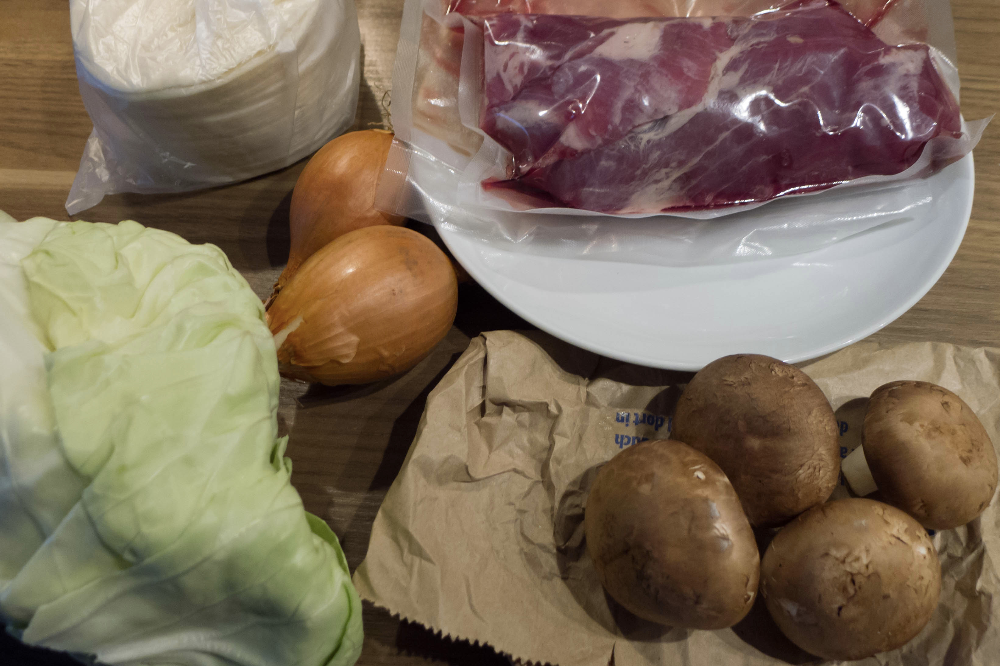 Uns hungerte mal wieder nach Teigtaschen. Da wir sowohl einige ostasiatische Teigtaschen als auch russische und mittelasiatische kennen und mögen, ist die Entscheidung für eine bestimmte Variante manchmal nicht einfach. Wenn man am Wochenende die Vorräte studiert, kommt dabei auch mal eine ganz neue Variante zustande – so auch heute. Die Sortierung und Sichtung des Gefrierfaches hatte eine „abgelaufene“ Packung taiwanischer Dumplingskins zu Tage gebracht. Diese hatten zwar noch keinen Gefrierbrand angesetzt, sollten dann aber doch mal weg. Hinzu kamen Reste eines Kohlkopfes, vier einsame Champignons und ein Stück Wildschwein.