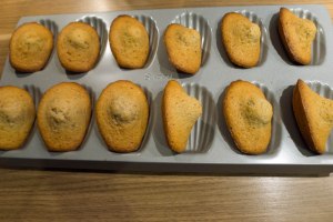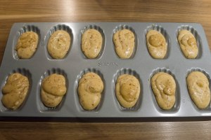 Die Zutatenkombination hörte sich gut an, also testete ich sie. Allerdings ließ ich die geforderte Zitronenschale weg und habe mich von der Technik her an das gehalten, was ich für meine ersten Madeleines gelernt habe: 12 Minuten bei 170°C Umluft hörte sich für mich unrealistisch an. Auch die Zwischenkühlung des Teiges gibt es im abgedruckten Rezept nicht, die ist nach französischen Quellen aber die einzige Möglichkeit, die Madeleines zur typischen „Knubbelbildung“ zu bewegen. Nicht zuletzt steht über dem Rezept, es wäre eine Menge für 12 Stück, allerdings bekomme ich aus diesen Zutaten regelmäßig 24 große Madeleines. Im Gegensatz zu meinen ersten Madeleines habe ich für dieses Rezept die Butter – wie verlangt – geschmolzen, was sich nicht nachteilig auf das Produkt auszuwirken scheint.
