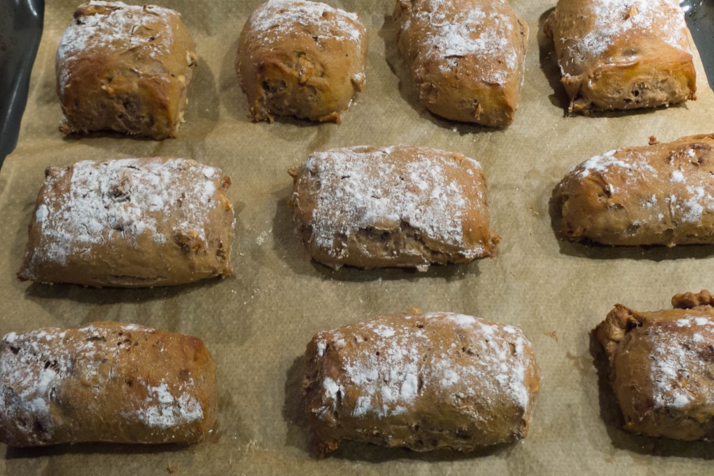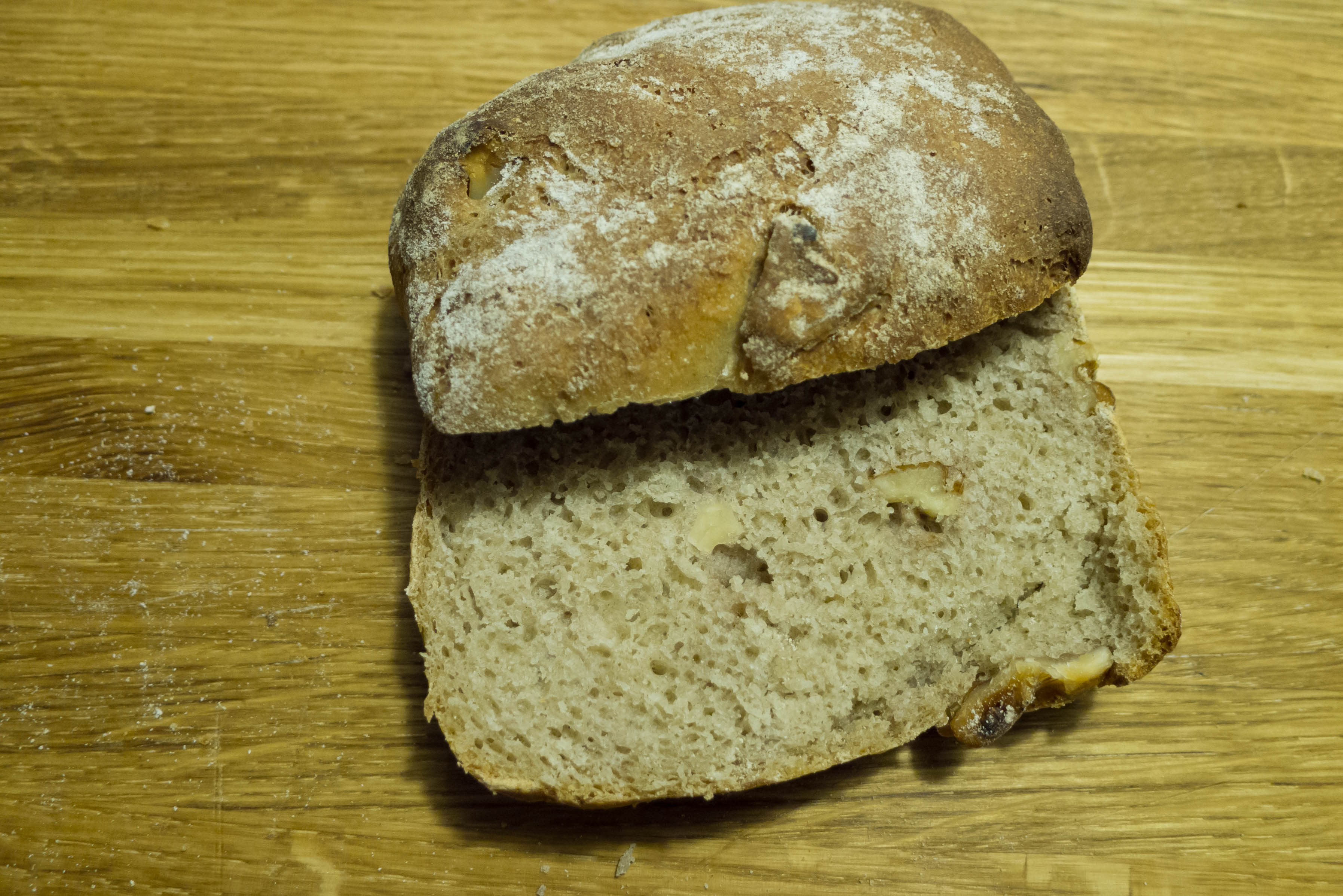 Aus Zeitvertreib die Online-Bestände unserer Stadtbücherei durchblätternd, fand ich vor einigen Wochen ein von der Stiftung Warentest herausgegebenes Frühstücksbuch mit dem Titel halb zehn, geschrieben von Agnes Prus. Das erste Rezept in diesem Buch sind Walnussbrötchen. Als mein Dauertestesser kurz darauf den Appetit auf Walnussbrot (oder -brötchen) ankündigte, fiel mir das Rezept wieder ein. Meine gedruckten Backbücher im Regal gaben zu diesem Thema leider nicht viel her auch die Recherchen im Internet brachten nichts zu Tage, was mich zum Nachbacken animierte. Also testete ich das genannte Rezept. Im ersten Versuch habe ich lediglich das geforderte Olivenöl weggelassen und mich ansonsten ziemlich genau an das Rezept gehalten. Zugegeben, es waren nicht, wie im Vorwort versprochen, „die krossesten frischen Sonntagsbrötchen“, aber der Geschmack ging in die richtige Richtung. Im nächsten Versuch habe ich an den Zeiten und Temperaturen gedreht. Und siehe da, die sind jetzt wirklich durchgebacken, dabei ziemlich locker und gleichzeitig saftig. Sie scheinen vor allem für herzhafte Beläge geeignet, z.B. für Camembert oder Rauchschinken. Ich werde sicherlich im Verlauf noch weiter an den Zeiten drehen und dabei die Hefe reduzieren, lecker und nachbacktauglich sind sie aber schon jetzt.