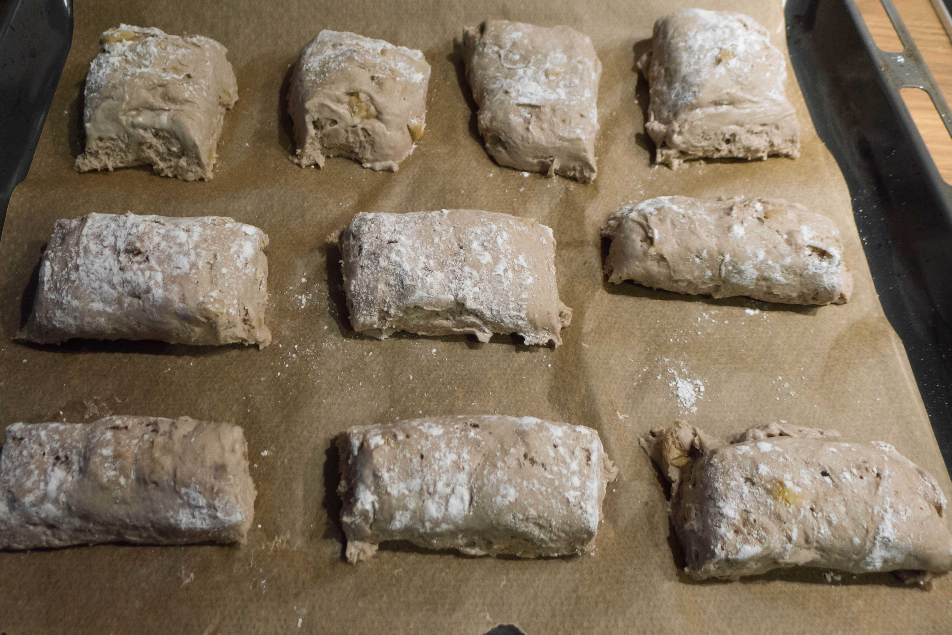 Am nächsten Morgen holt man den Teig aus dem Kühlschrank und formt daraus direkt Brötchen, ohne ihn vorher nochmals zu kneten. Die Autorin im Buch geht dabei so vor, dass sie Portionen mit einem Löffel absticht – wer den Teig über Nacht in einer runden hohen Schüssel hatte, wird auch genau das tun müssen. Wer den Teig in einem flacheren Behältnis hatte, kann einfach den Teig direkt dort mit einer Teigkarte in 8-10 etwa gleich große Stücke teilen und diese dann vorsichtig auf ein Blech setzen.