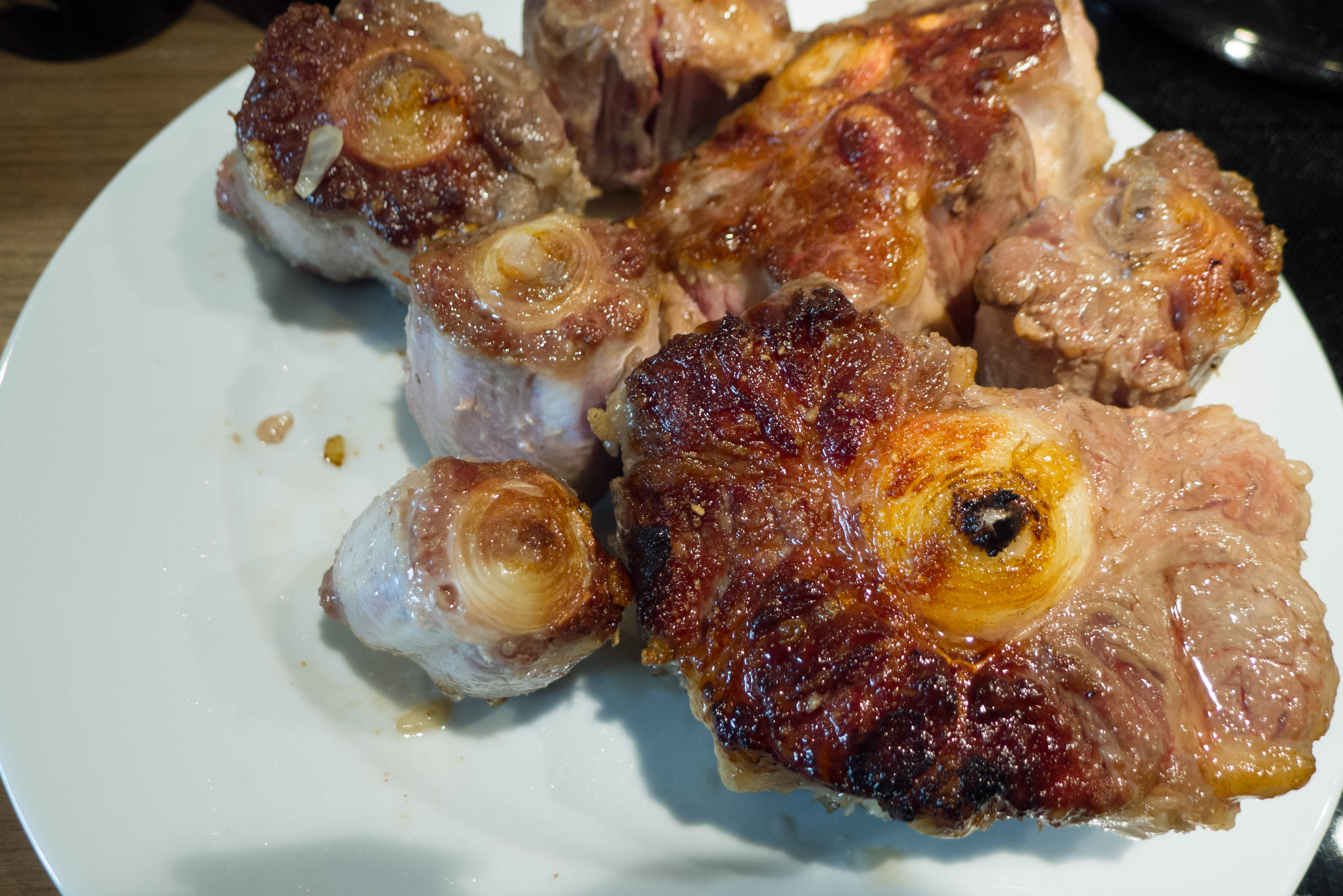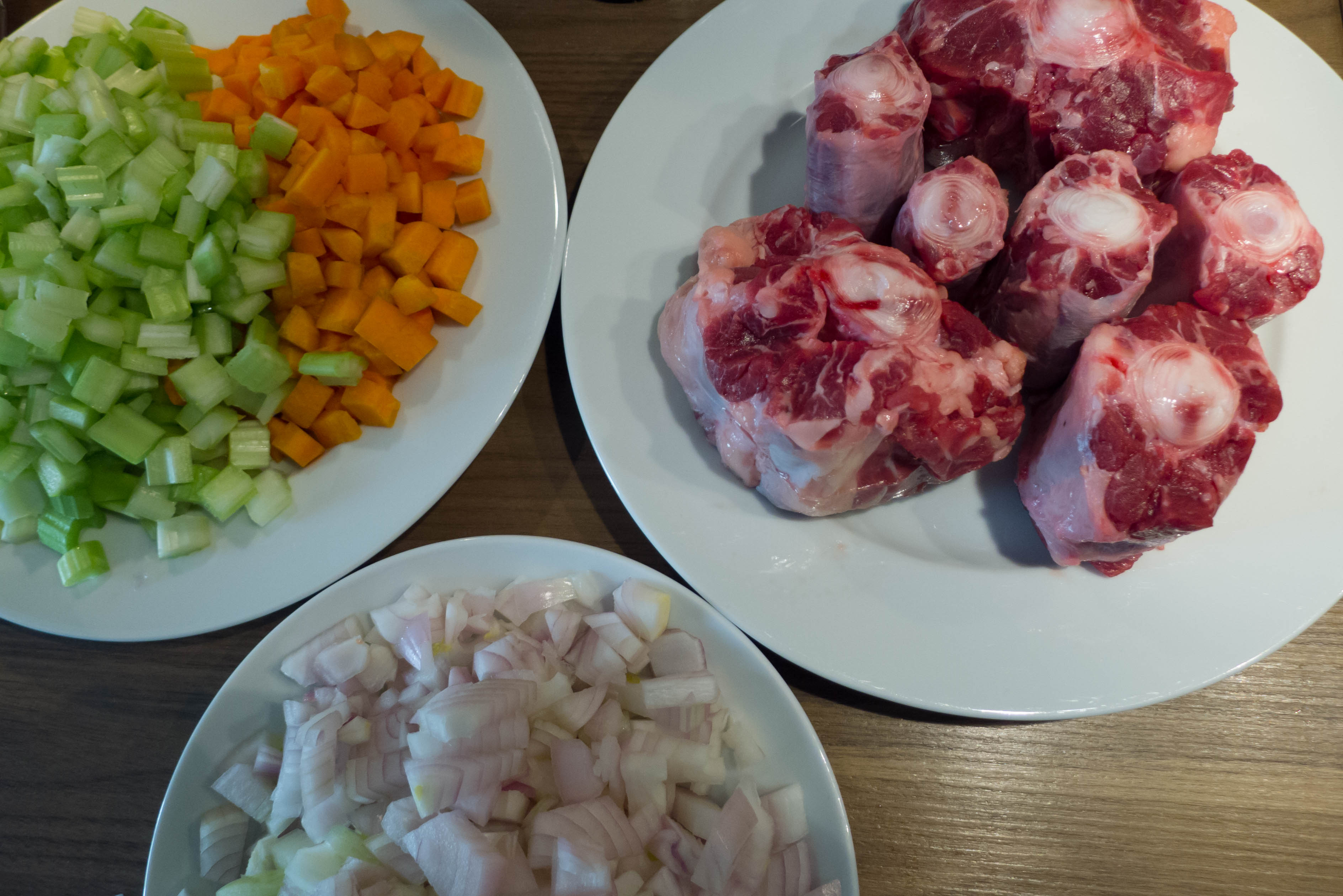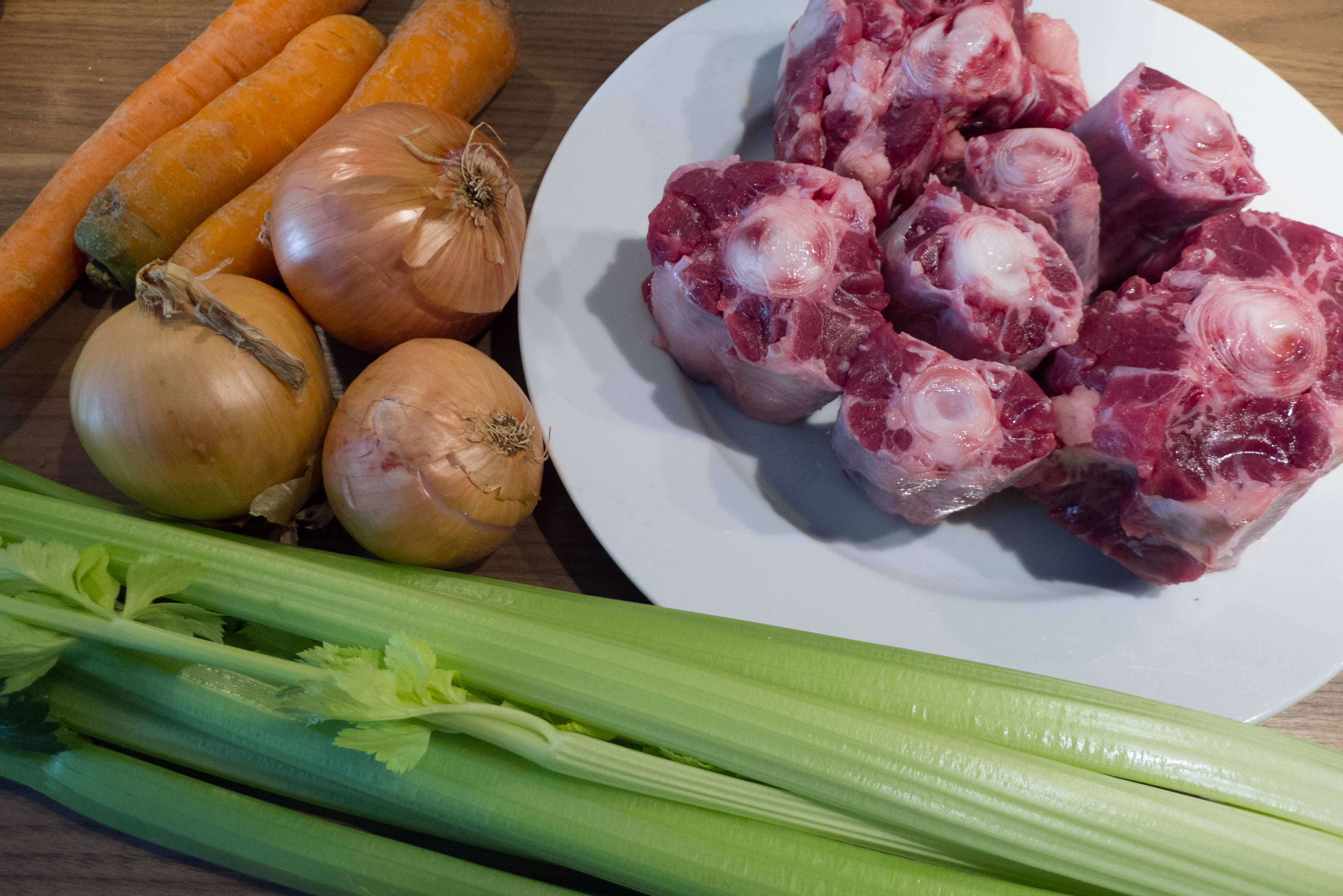 Der Ochsenschwanz hat vor Jahren erstmals Einzug in meine Küche gefunden: er wurde mir an der Metzgertheke als Grundlage einer Rinderbrühe empfohlen. Ich war erstaunt, wie reichhaltig und geschmacksintensiv die Brühe wurde. Mit der klassischen Ochsenschwanzsuppe hatte ich lange keine Berührungspunkte, bzw. ich kannte sie zwar vom Namen her, konnte mir aber nichts Leckeres darunter vorstellen. Als ich im vergangenen Herbst meinen aktuellen Rindfleischlieferanten fand, war für mich ein ausschlaggebender Punkt, dass sein Nose-to-Tail-Ansatz nicht nur theoretischer Natur ist, sondern sich in seiner regulären Fleischtheke finden lässt. Unter anderem hat er sowohl Nierenzapfen als auch „Ochsenschwanz“ regulär und regelmäßig im Angebot, nicht nur auf Bestellung als Sonderwunsch. Auf jeden Fall brachte mich das auf die Idee, die „klassische“ Ochsenschwanzsuppe kochen. Zunächst fand ich kein Rezept, das mich so recht ansprach. Dann sah ich eher aus Verzweiflung in meine alten Kochbücher und fand dort doch was ich suchte. Im Buch All Colour Cooking von Robin Howe aus dem Jahr 1980 (ich hatte es vor etwa 15 Jahren in einem Londoner Antiquariat für 50 Pence erstanden) gibt es ein Rezept, das eine deutsche Ochsenschwanzsuppe sein soll. Ich wandelte es geringfügig ab und habe nun ein Rezept, das ich immer wieder kochen will und laut Dauertestesser auch soll.